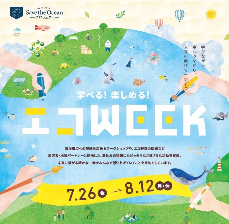 上記プロジェクトの強化期間である「エコWEEK」では、「エコ」「エシカル」をテーマとしたイベント・ワークショップ、出店店舗の取り組み・商品紹介などの情報を集積し環境保全についての情報発信を行ってまいります。本年は初回開催から4回目を迎え、近隣人気施設である金沢動物園や横浜・八景島シーパラダイス主催のクイズ大会やタッチプールの展示、関東学院大学の教授と学生が教える夏休みの宿題にぴったりな実験イベント、出店店舗であるSHIPS株式会社主催のうみゴミでつくる万華鏡イベントなど盛りだくさんな内容となっております。