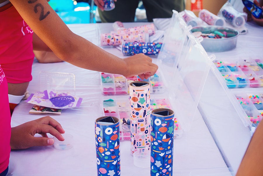 海でひろったプラスチックゴミや洋服の廃材を使い、自分だけのカラフルなサステナブル万華鏡を作れます。