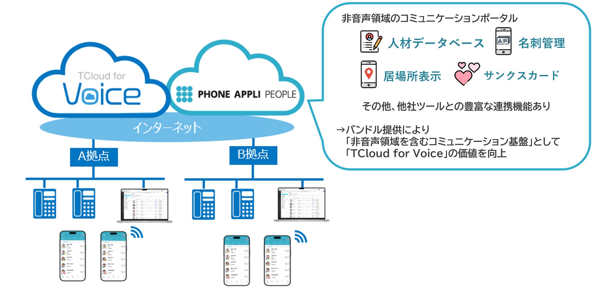 「TCloud for Voice」の強みである柔軟性の高い音声コミュニケーション基盤と、「PHONE APPLI PEOPLE」の強みである非音声領域(人材データベース・名刺管理・居場所表示・サンクスカード等)のコミュニケーションポータルを掛け合わせ、標準機能として提供することで、コミュニケーション全体を包括する基盤としてサービス活用が可能となります。