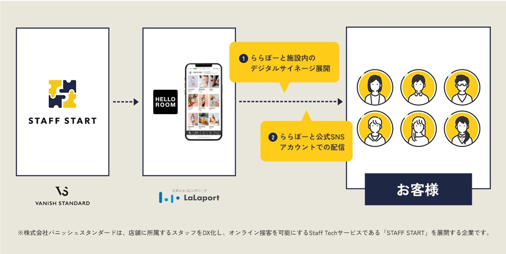 株式会社バニッシュ・スタンダード(本社:東京都渋谷区、代表取締役:小野里 寧晃)は、三井不動産商業マネジメント株式会社(所在:東京都中央区 代表取締役社長 大林修)へ、2024年3月よりスタッフDXアプリケーションサービス「STAFF START(スタッフスタート)」を提供したことをお知らせします。
