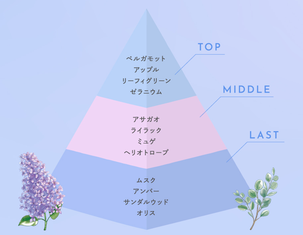 清潔感と静けさを演出するリーフィグリーンに、アサガオ、ライラック、ミュゲがやさしく織りなす上品で透明感のあるフローラルな香りに仕上げました。