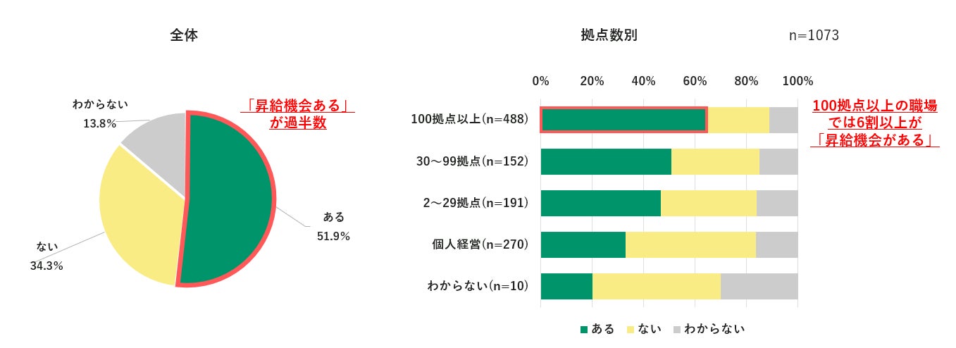 全体の過半数が「ある」と回答。昇給機会の有無は企業規模(拠点数)と明確な相関があり、拠点数が多くなるほど、昇給機会があることがわかった。100拠点以上の6割以上が「ある」と回答したのに対し、個人経営の企業で昇給機会があるのは3割程度にとどまった。