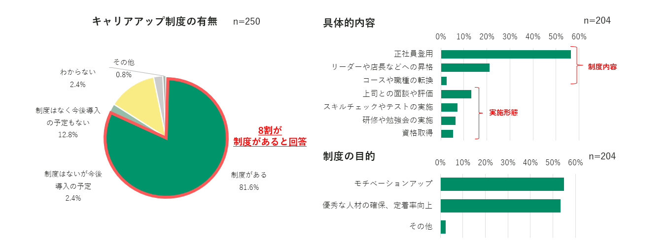 キャリアアップ制度を設ける企業が8割に達した。内容として最も多いのは「正社員登用」で5割を超える。実施形態は面談を通じての評価が最も多く、次いでスキルチェックやテストを実施するという回答があった。また、制度の目的としてはモチベーションアップと人材確保がほぼ同じ割合で並び、非正規社員の戦力化が重要な課題であることがうかがえる結果となった。