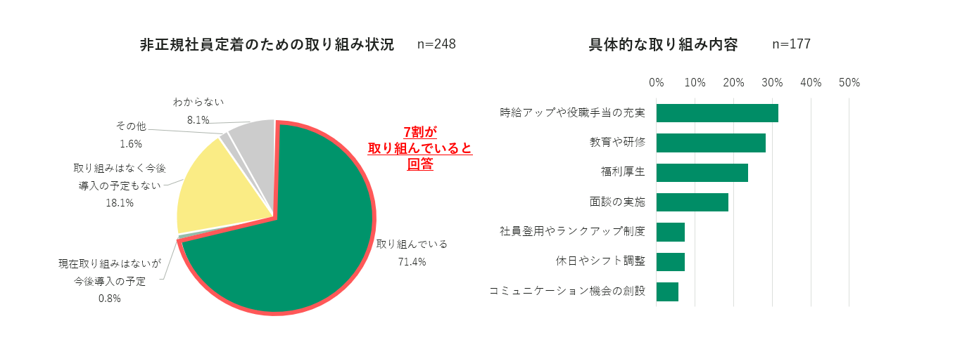 7割が「非正規社員定着のための取り組みをしている」と回答。内容は、最も多かったのは時給や役職手当などの報酬面を充実させるという回答で3割を占めた。次に教育や研修制度を充実させているという回答が続き、育成にも注力している企業が多いことがわかった。