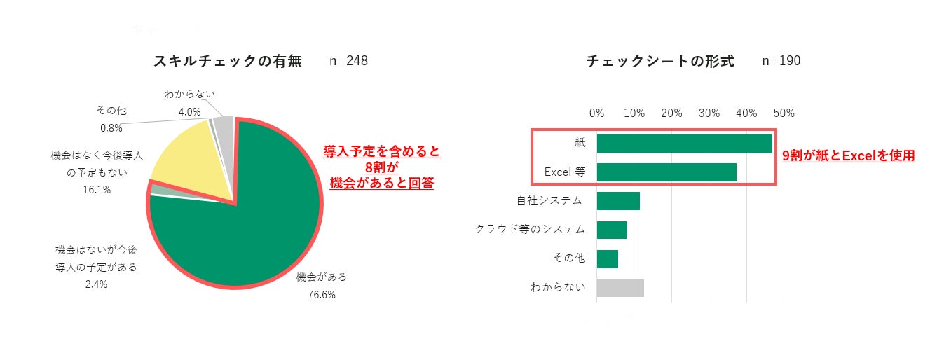 8割が「スキルチェックの機会がある」と回答(左)。また、スキルチェックに使用する資料は「紙」が最多で、次にExcelなどの表計算ソフトを使うという回答が続いた。また、Excelで作ったスキルチェックシートを紙で印刷し、アルバイトは紙で回答するような形式も実例としてみられることから、資料作成ツールとしてのExcel、その出力先としての紙というあり方を踏まえると、両方を使用しているケースが9割程度あるとみられる。専用システムを使用している企業は少数で、手作業が多く発生していると考えられる。