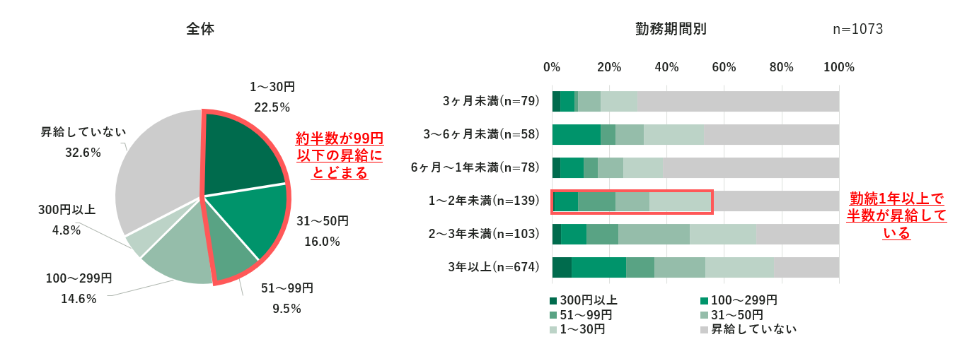 全体の約半数が「99円までの昇給」で留まっており、300円以上昇給したのは5%程度、昇給していないという回答も3割あった(左)。勤務期間別にみると、勤続1年で約半数が、3年以上になると8割程度が昇給を経験している(右)。