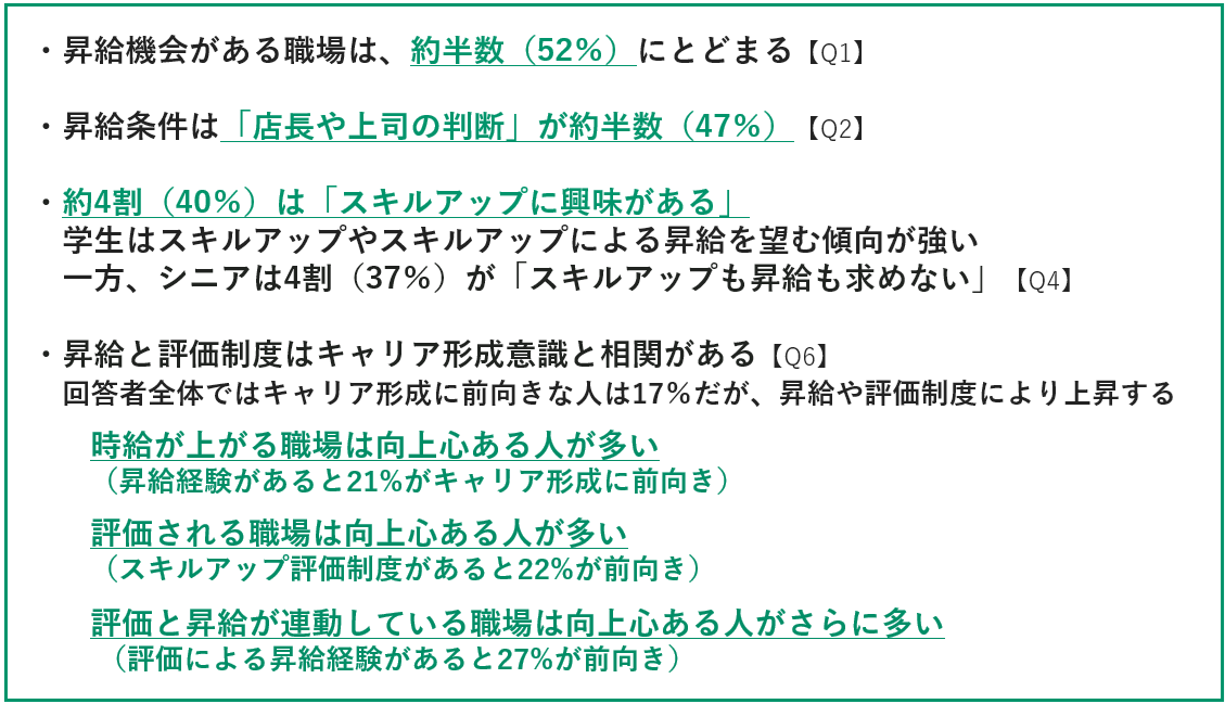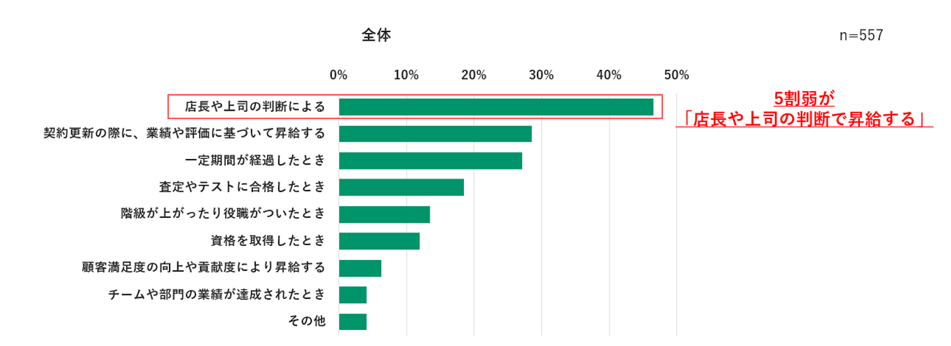 昇給条件に一定の基準がなく、「店長や上司の判断による」という回答が約5割に達した。昇給条件が決まっていない、または決まっていても開示されていないか知る機会がないなど、どうすれば昇給するのかが不明なままで働いていることが多いと考えられる。