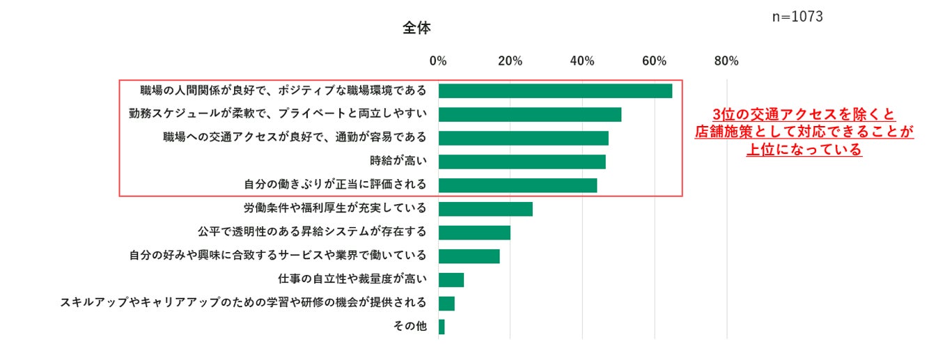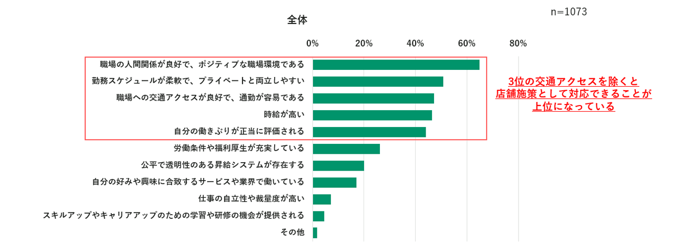 人間関係が良好であること、勤務スケジュールが柔軟であること、アクセスが良好であることが上位となり、時給額や昇給制度などよりも重視されている。交通アクセスを除くと店舗内マネジメントで対策可能な環境要因であることがわかる。