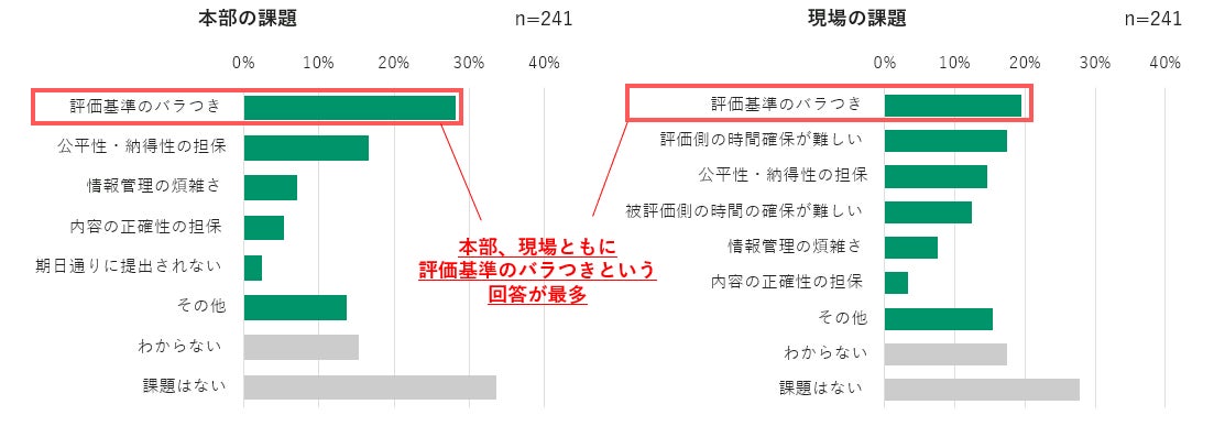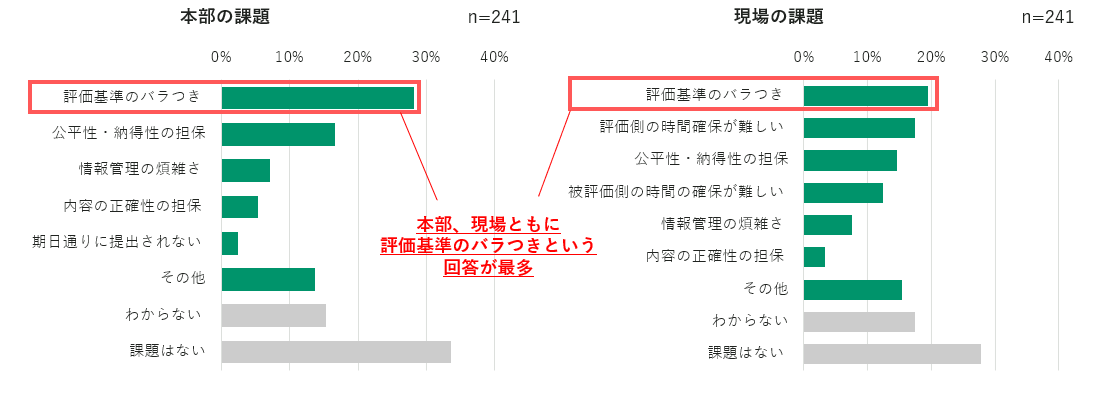 キャリアアップ制度を運用していく上での課題は、本部・現場ともに「評価基準のバラつき」という回答が最多だった。評価項目自体は定まっていても、現場従業員ひとりひとりの技能や知識は定量化できるものばかりではないため、判定基準が属人化していたり、正しく評価できているかを検証する手段がないことが考えられる。Webアンケート調査のQ4では5割の非正規社員が「店長や上司の判断で昇給する」と回答しており、評価基準のバラつきが反映されているとも推察できる。現場側では評価側の時間確保も2番目の課題として挙げられており、実地作業のスムーズさや作業効率化も課題になっていると考えられる。