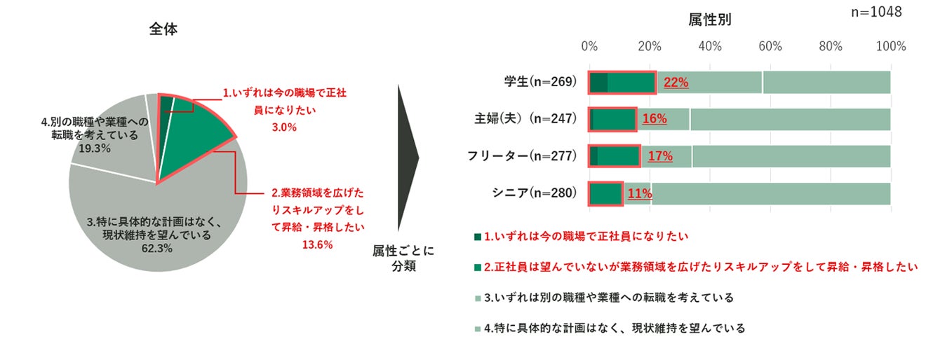 最も多かったのは「現状維持」を望む声で全体の6割を占めた。正社員を希望する/業務の拡大やスキルアップを通して昇給・昇進を望むポジティブな回答は17%程度あり(赤枠)、属性別の傾向をみると、現在での職場でのキャリアアップを望むと回答したのは学生が22%で最も高く、シニアは11%と低い結果になった(右)。