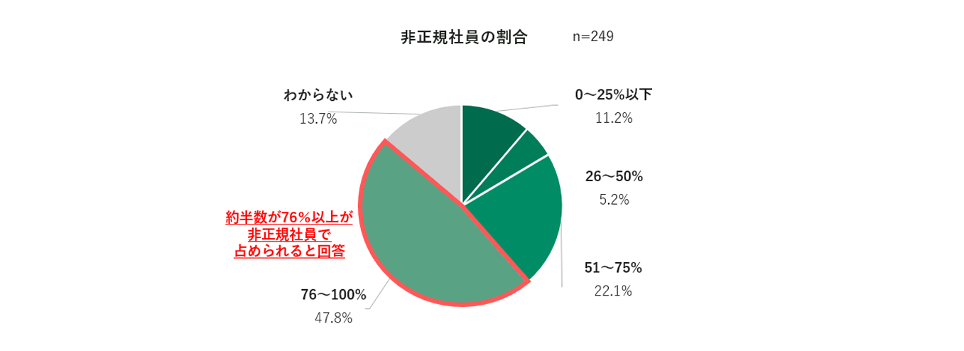 約半数が76%以上と回答。非正規社員が現場の労働力の中枢となっていることがうかがえる結果となった。