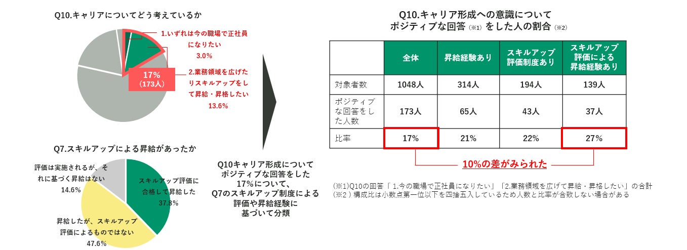 また、昇給経験やスキルアップ評価制度の有無による有意差がみられるかを検証したところ、昇給経験がある場合は21%、スキルアップ評価制度がある場合は22%が今後の働き方にポジティブな回答をする傾向があった。スキルアップ評価による昇給を経験した場合は27%と、全体より10%高い結果となった。これらの結果から、昇給やスキルアップ評価制度は、キャリア形成の意識向上に影響すると考えられる。