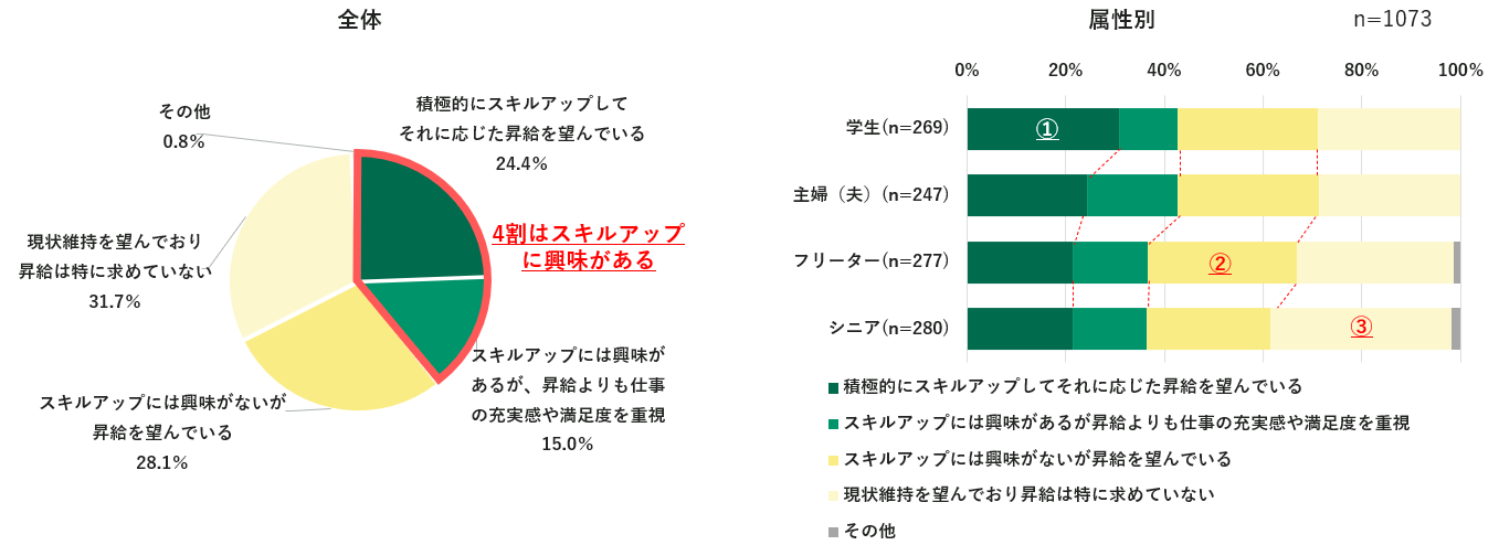 「スキルアップに興味がある」という回答は全体の約4割を占めた。ただし、昇給につなげたいという回答は25%で、15%は仕事の充実感や満足度を重視したいという結果だった(左)。属性別にみると、スキルアップするしないに関わらず昇給を望む声は学生で最も多く(右①)、フリーターでは「スキルアップを望まず昇給はしたい」という回答が多くなっている(右②)。シニアは「現状維持を望み、スキルアップも昇給も求めない」という回答が4割となった(右③)。