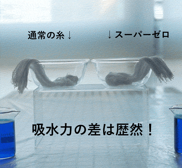 繊維を束ねて一定方向に捻るだけの通常の糸に対して、スーパーゼロは通常の捻りに加え、水溶性の糸を合わせ逆方向へ2倍撚り、そこから水溶性の糸を溶かすことで元撚り方向に戻ろうとする「反発による多量のすきま」を生じさせて、糸をふわっと膨らませる特殊な撚糸工法です。