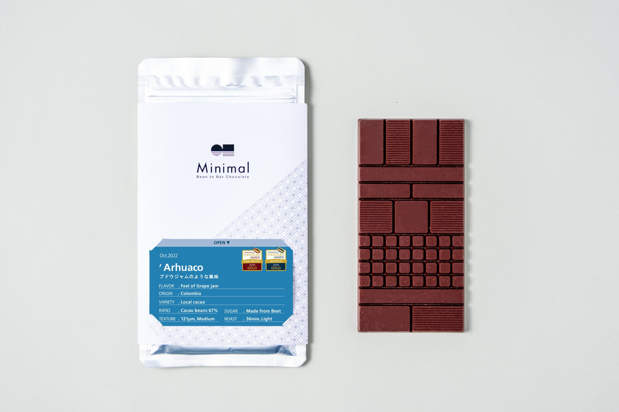 Minimalでは、Micro-batch – Plain/origin dark chocolate bars部門で板チョコレート「'Arhuaco」がGold(Rough Ground部門)とSilverを受賞、「FRUITY」はSilverを受賞しました。Dark chocolate bars部門では、日本で唯一の受賞となりました。