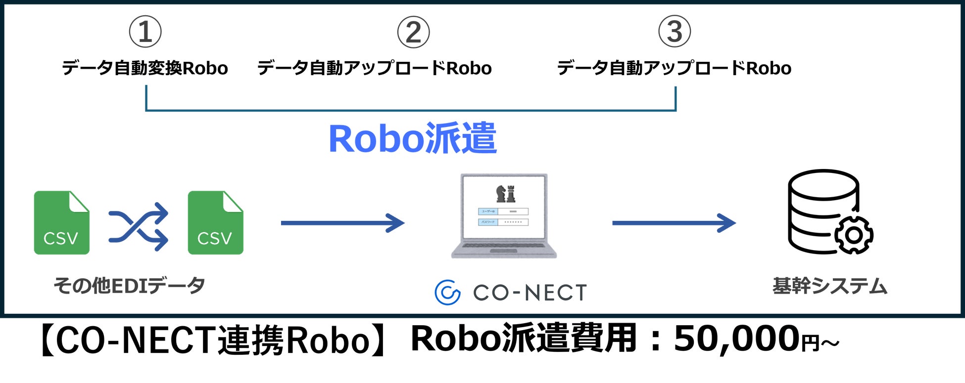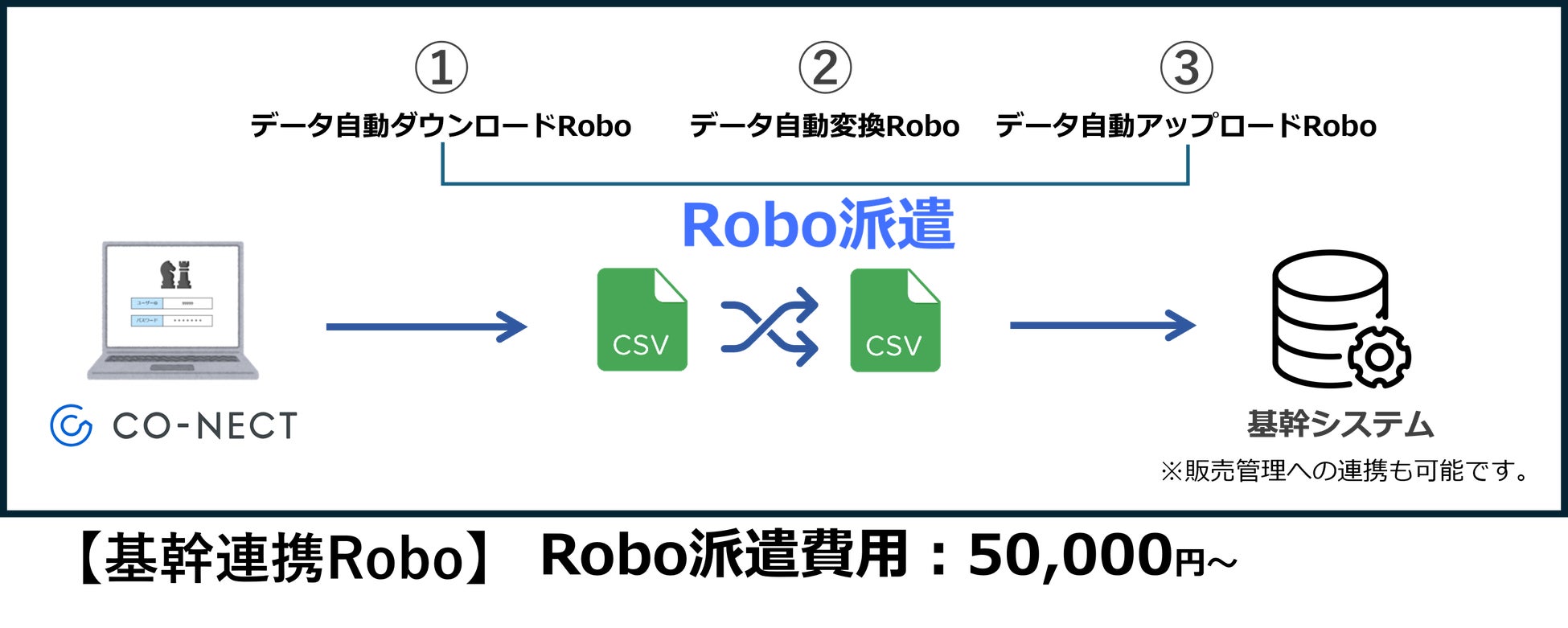 BtoB受発注システム「CO-NECT」は、受注企業が取引先から専用サイトを経由して注文を受けることで、FAXや電話などのアナログな受発注をかんたんにデジタルに置き換え、一元管理することができるツールです。それだけではなく、データを集約し、売上分析することが可能です。多忙な受注業務の現場では、誤った入力や対応漏れなど人手によるミスが起き、取引先からのクレームが発生しかねません。RPA「Robo派遣」サービスと組み合わせて活用することでミスを無くし、業務担当者の負荷なく「CO-NECT(コネクト)」上で集約された受注データを活用することができ、売上が拡大しても受注業務が増えない自動化を前提とした受注業務体制の構築ができます。
