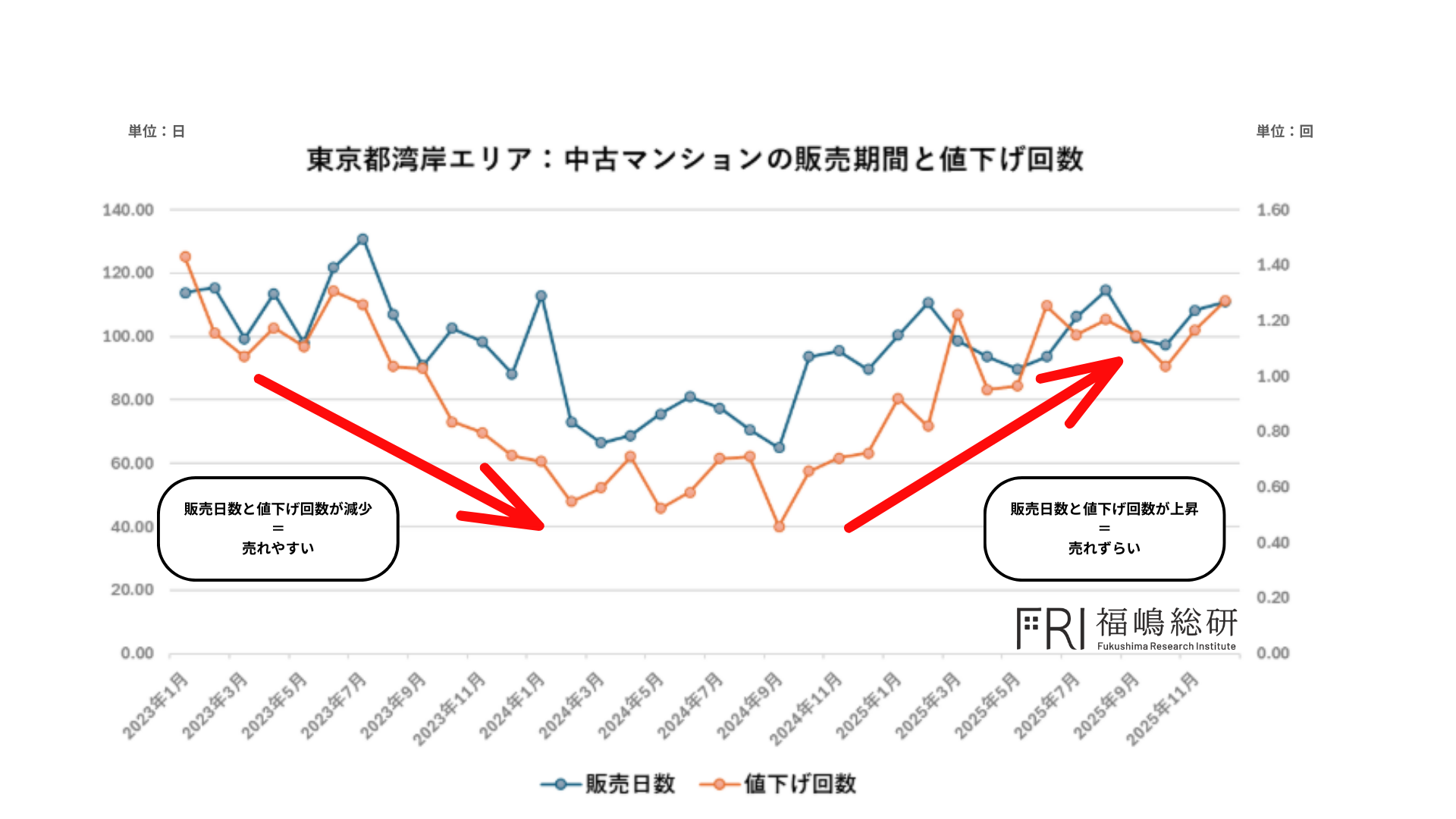 しかし、「金利のある時代」と明確に意識されるようになった2024年7月前後以降、「販売日数」および「値下げ回数」はともに増加に転じており、「価格を下げても売れない」物件が増え始めている状況がうかがえます。