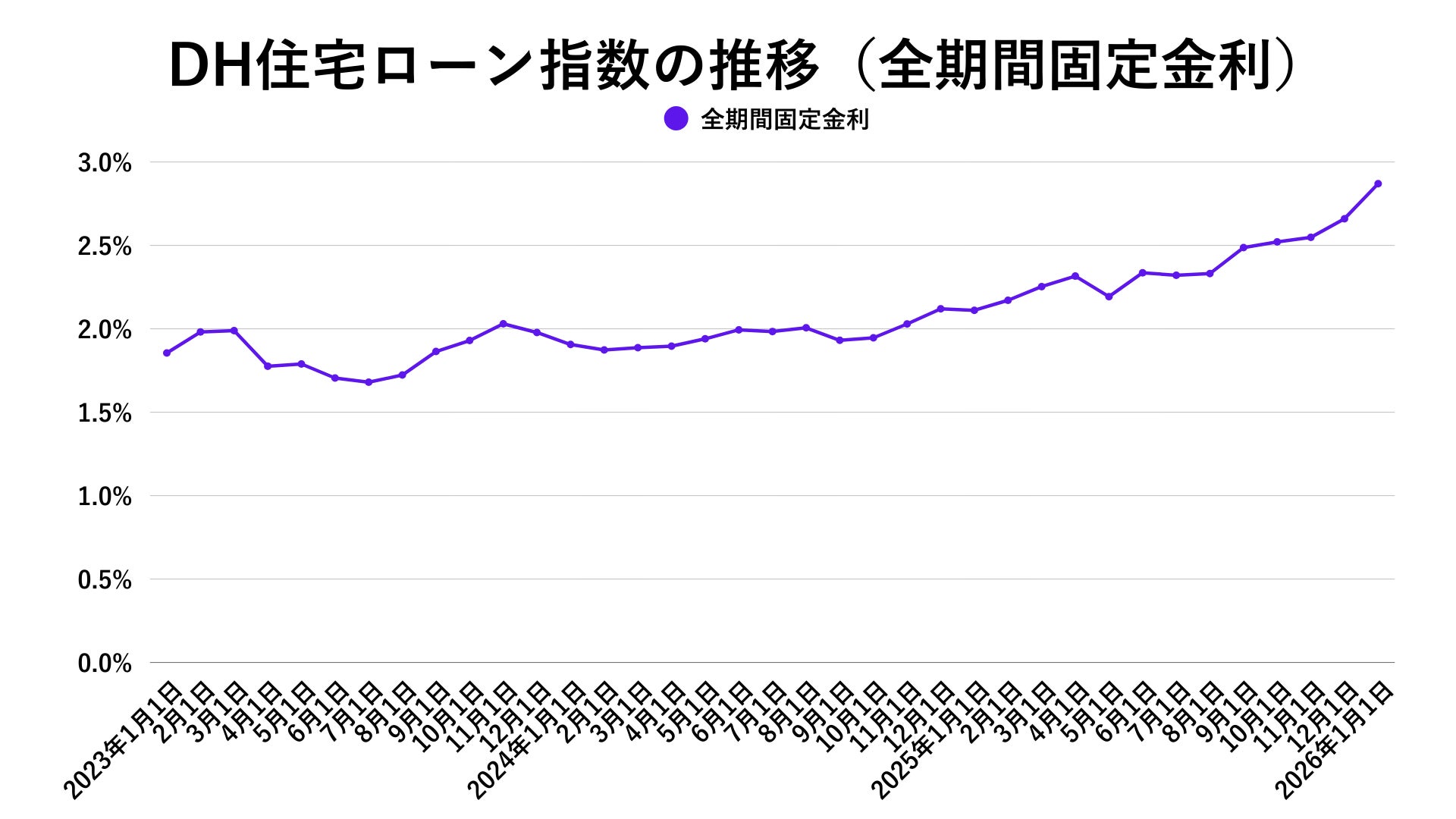2026年1月のDH住宅ローン指数における全期間固定金利は2.868%となり、前月の2.664%から上昇しました。前年同月の2.111%と比較しても上昇基調が続いており、全期間固定金利も依然として金利上昇局面にあるといえます。また、フラット35は約12年ぶりに2%台に達し、長期固定金利全体の水準が一段と切り上がったことを示しています。