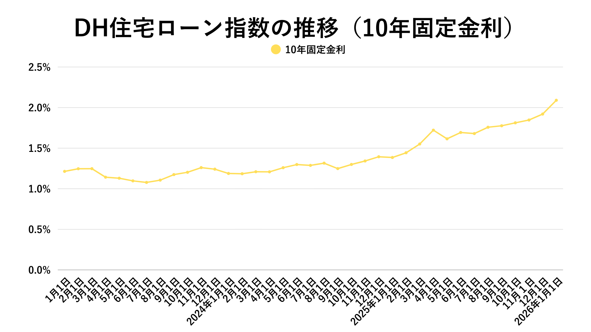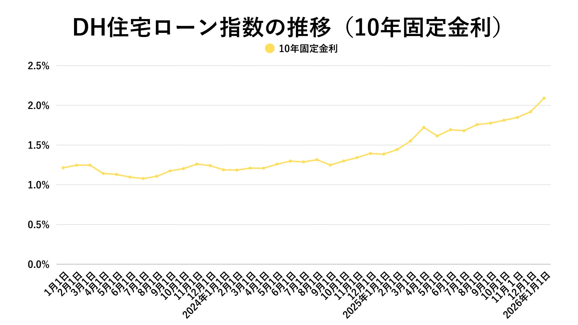 2026年1月のDH住宅ローン指数における10年固定金利は2.086%となり、前月の1.916%から大きく上昇しました。前年同月の1.385%と比べても上昇幅は顕著であり、10年固定金利は明確に上昇局面の真っただ中にあるといえます。この背景には、日本国債10年物利回りが2%台に到達するなど、長期金利全体が上昇していることがあります。