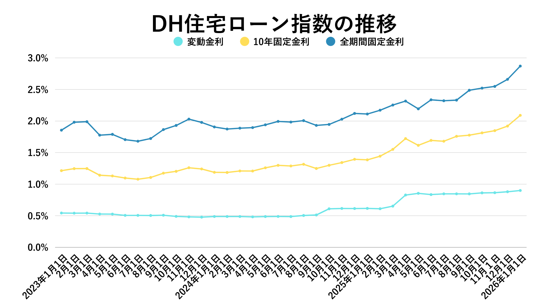 2026年1月のDH住宅ローン指数における変動金利は0.902%となり、前月の0.875%から小幅に上昇しました。また、前年同月の0.616%と比べても明確に高く、長らく続いていた低金利局面から、ようやく本格的な上昇トレンドに入ったと評価できます。