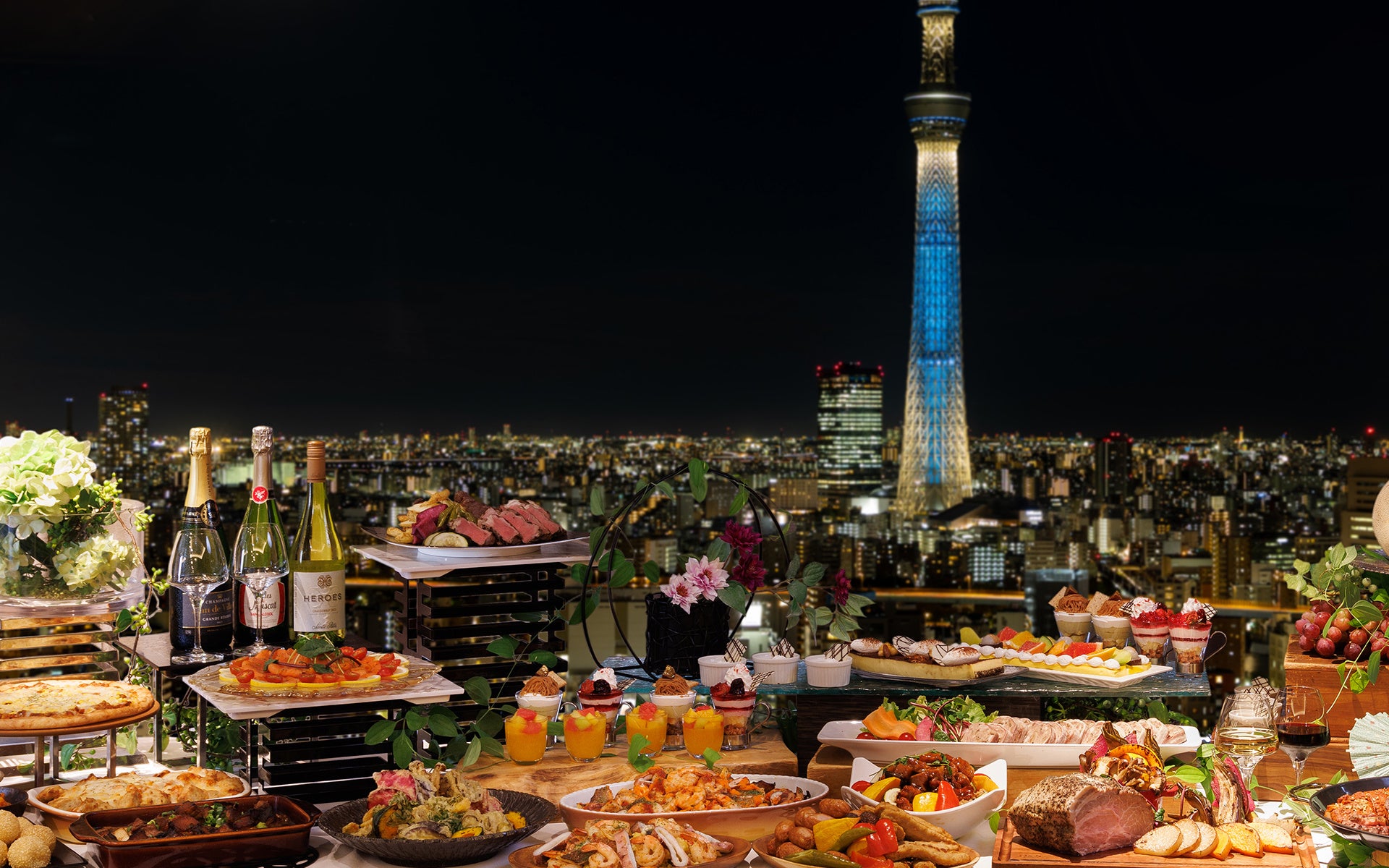 地上約100メートルから望む浅草の絶景とともに、高知フェア「高知・味の紀行」の料理“高知真鯛の藁焼き”や、華やかなクリスマス限定ブッフェをブッフェスタイルでお楽しみいただけます。