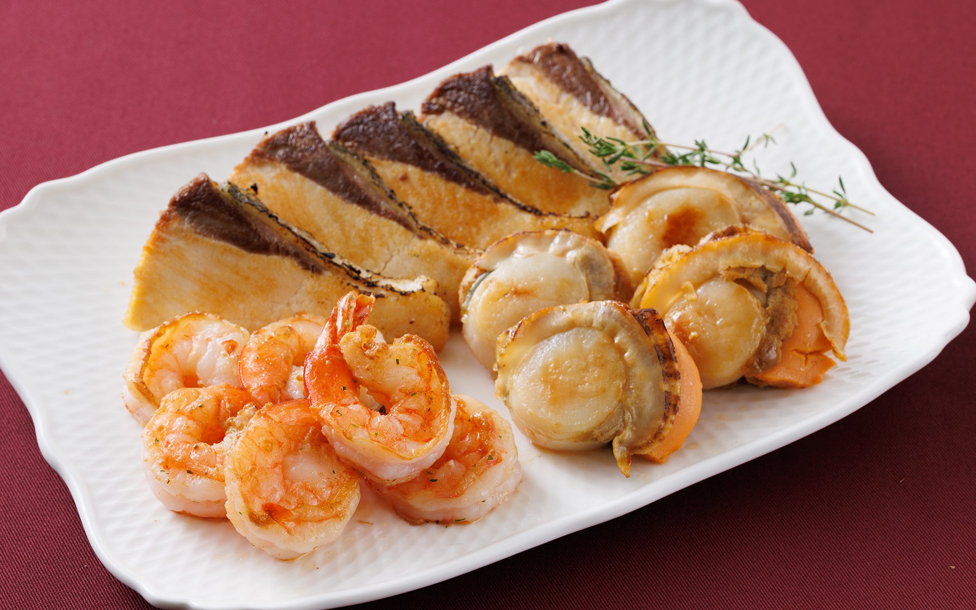香ばしく仕上げた牛ロースのグリル、豚ロースのグリル、ソーセージグリルに加え、海老や帆立、白身魚を香ばしく焼き上げた魚介のグリルもご用意しています。