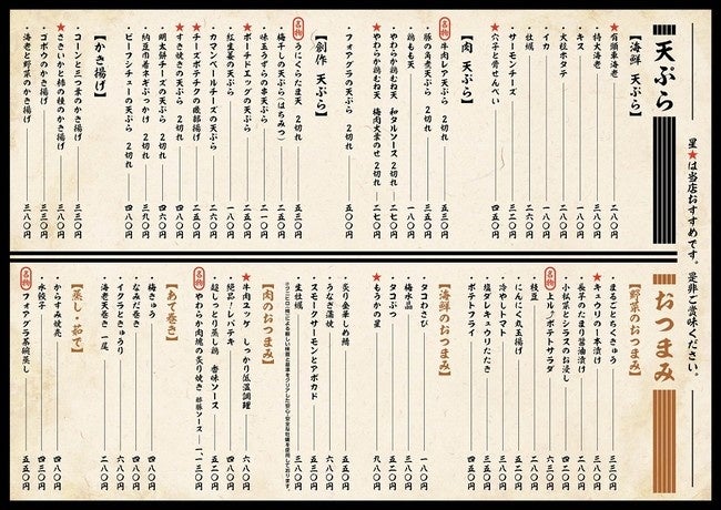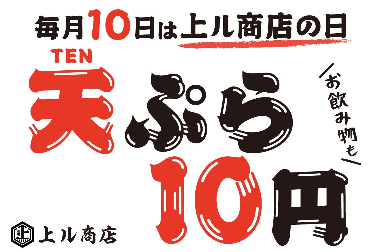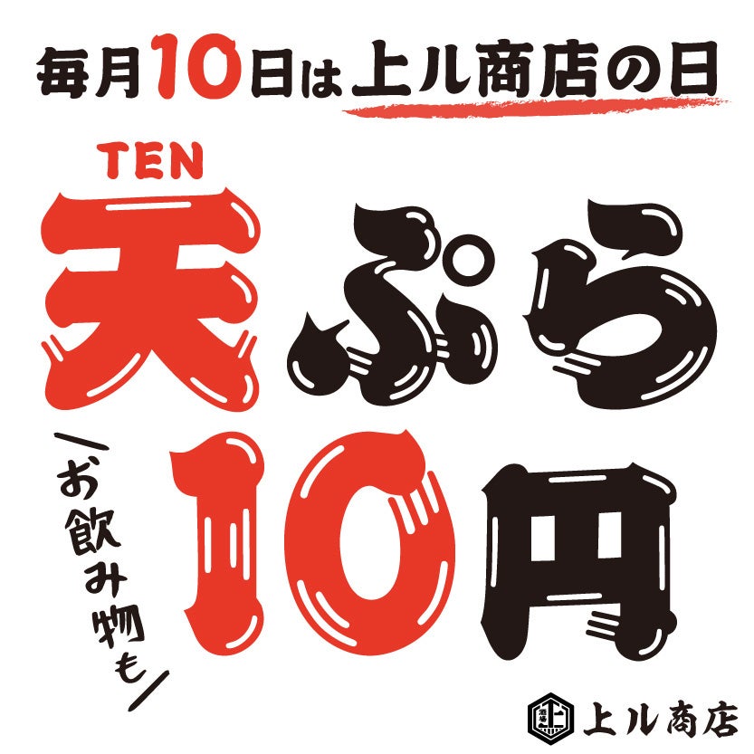- 毎月10日は”上ル商店の日” 対象の天ぷらが1個10円、さらにドリンクも1杯10円に!お得に楽しめる