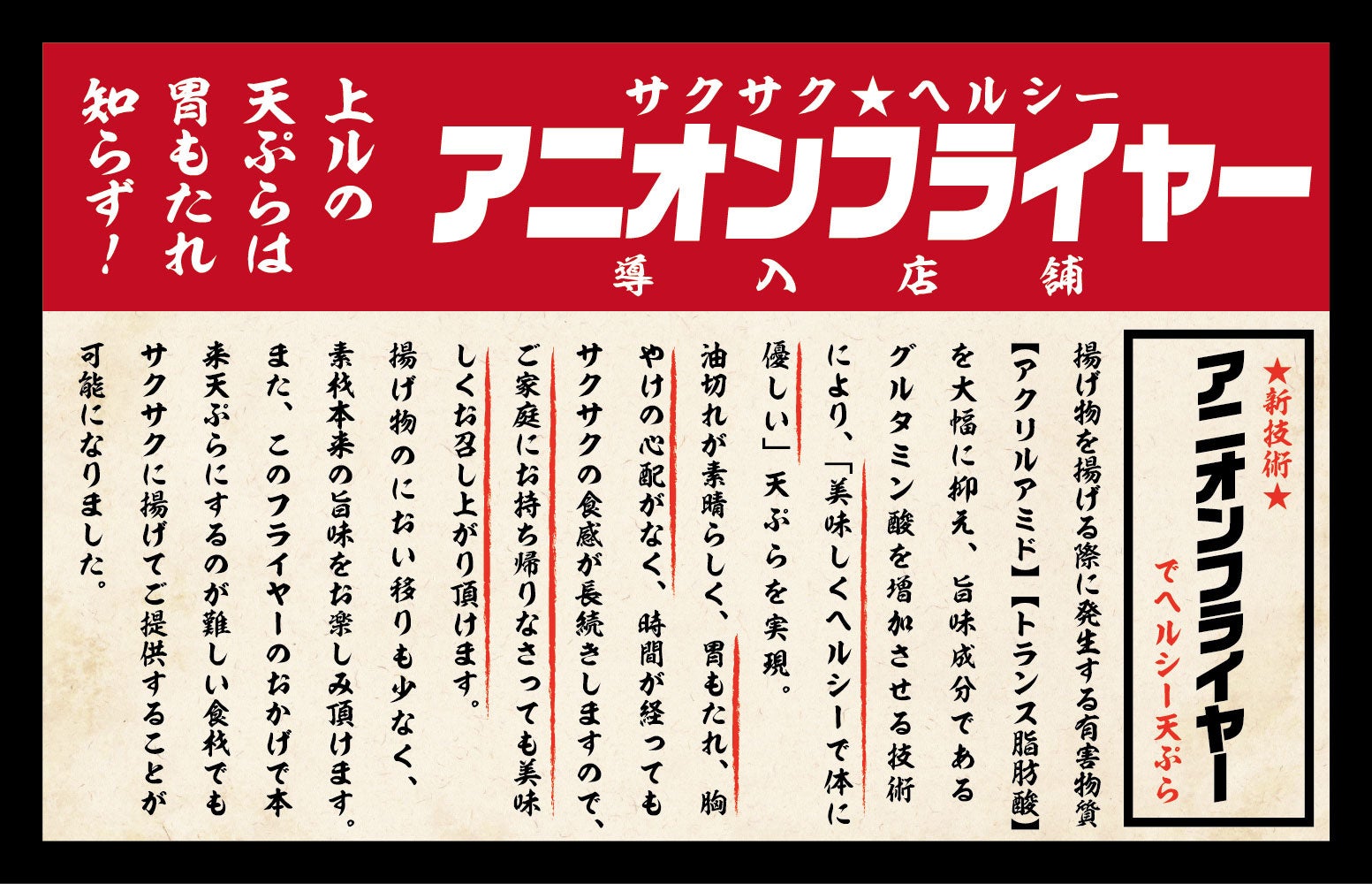『天ぷら酒場 上ル商店』の天ぷらは、”アニオンフライヤー”を使用しております。