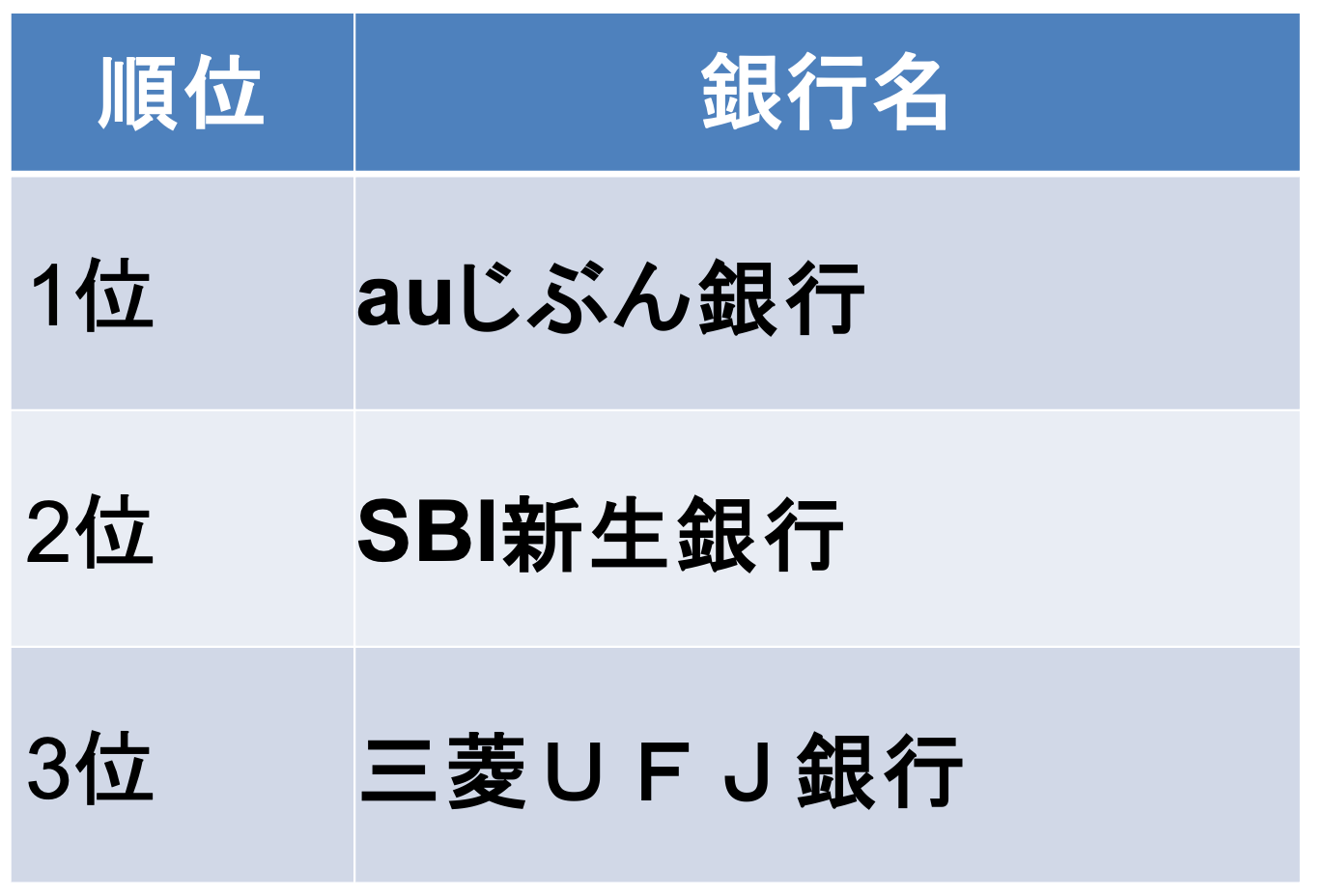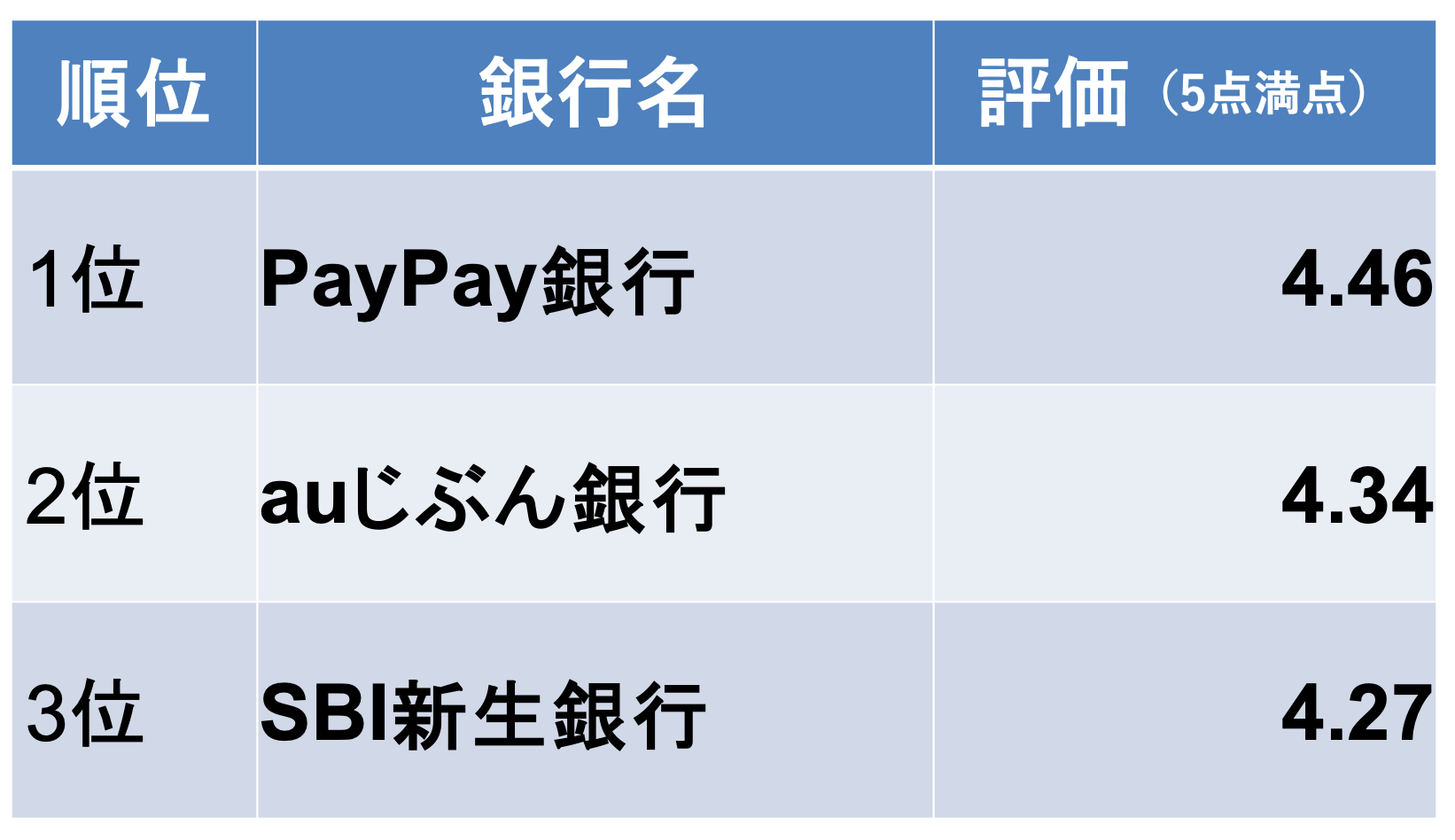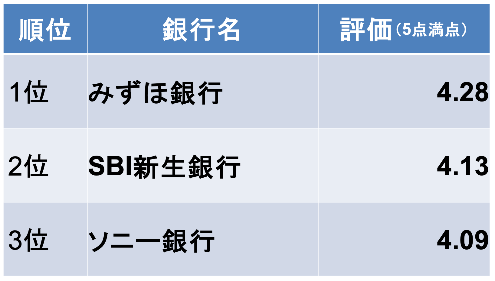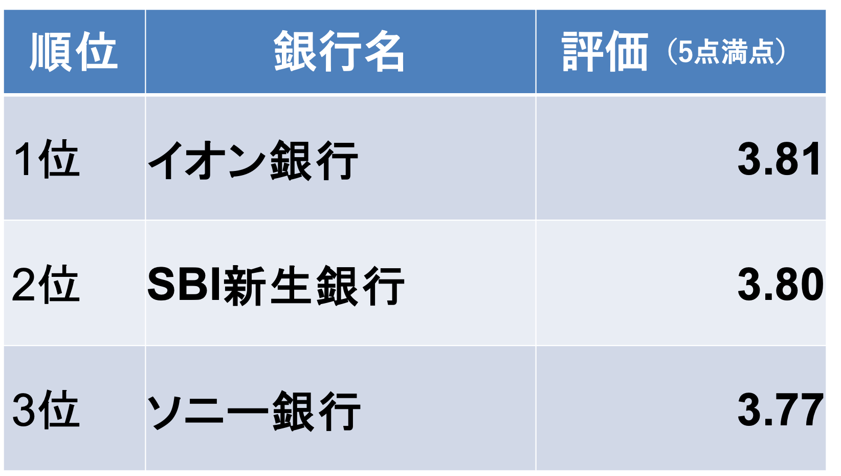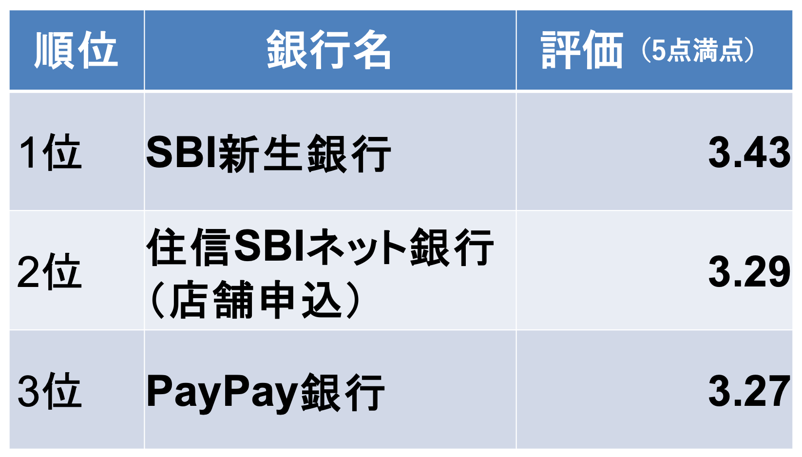 僅差でイオン銀行が1位となりました。実店舗もあり、手厚い対応を受けられる点が好評であり、「店頭とWEBどちらでも申し込めるのはいい」と高く評価する声が多かったです。SBI新生銀行は「返信も早く、必要書類もデータで大丈夫という融通が効くところが良かった」とスピーディーな対応を評価する声が見られました。