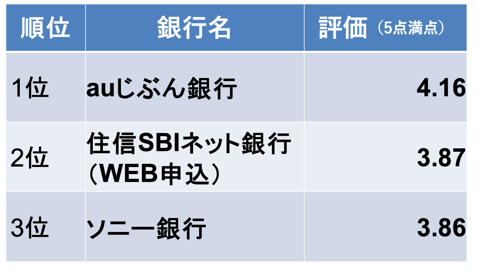 PayPay銀行が1位となりました。頭金10%以上で0.25%などの金利キャンペーンが高く評価されているものと思われます。ユーザーからも「0.25%はとび抜けて低い」「特別な条件なく、最低水準の金利が適用」と評価する声が多かったです。auじぶん銀行も同様、「他社キャンペーンを除けば最安クラス」など、満足度の高い声が多いです。