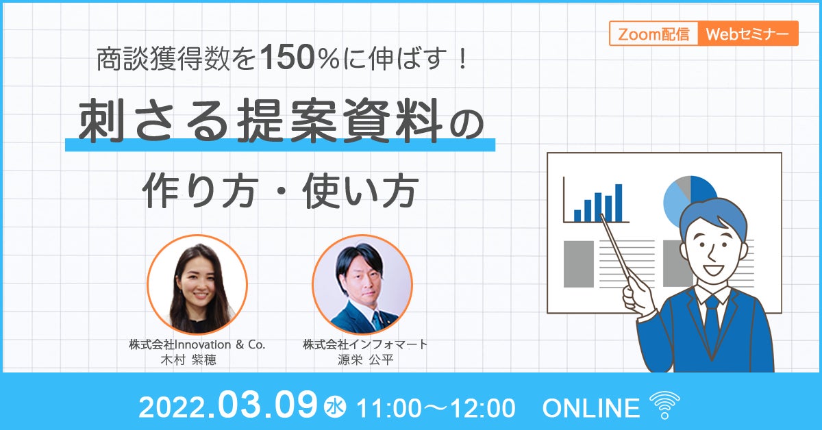 東京都渋谷区、代表取締役社長:遠藤俊一、以下「Innovation & Co.」は、株式会社インフォマート(本社:東京都港区、代表取締役社長:中島健、以下「インフォマート」)と『商談獲得150%に伸ばす!刺さる提案資料の作り方・使い方』をテーマとしたセミナーを2022年3月9日(水)に開催します。