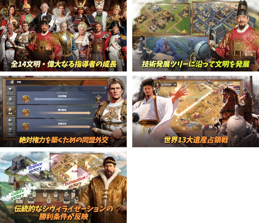 『シヴィライゼーション:覇者の君臨』は、世界中で長らく愛され続けるシミュレーションゲーム「シヴィライゼーション」のIPを活用し、同シリーズ初のモバイルMMOSLGとして制作された新作タイトルです。「シヴィライゼーション」シリーズの中でも人気作である『シヴィライゼーション5』をベースに、3つの勝利条件(制覇、科学、文化)や偉人などのコア要素をそのまま継承。さらに、本作だけの新要素として、同盟同士の競争と大型PvP対戦、シーズン制コンテンツを搭載し、MMOの面白さや醍醐味をご提供いたします。