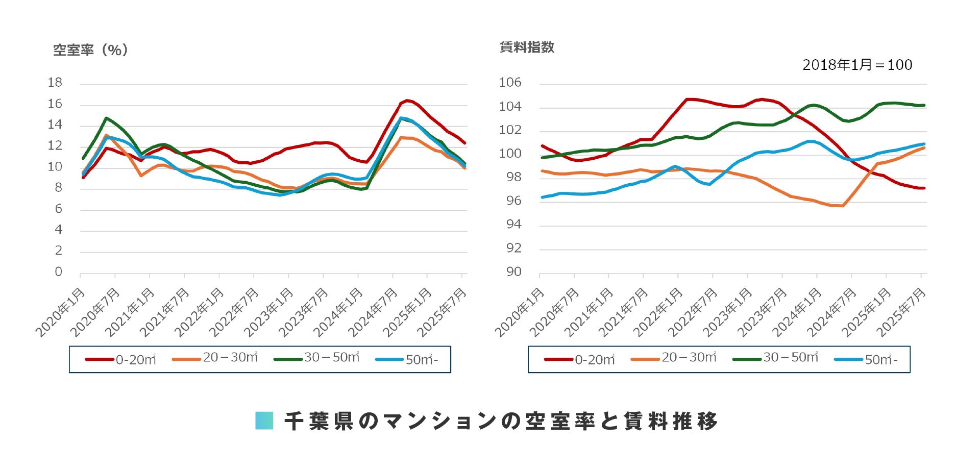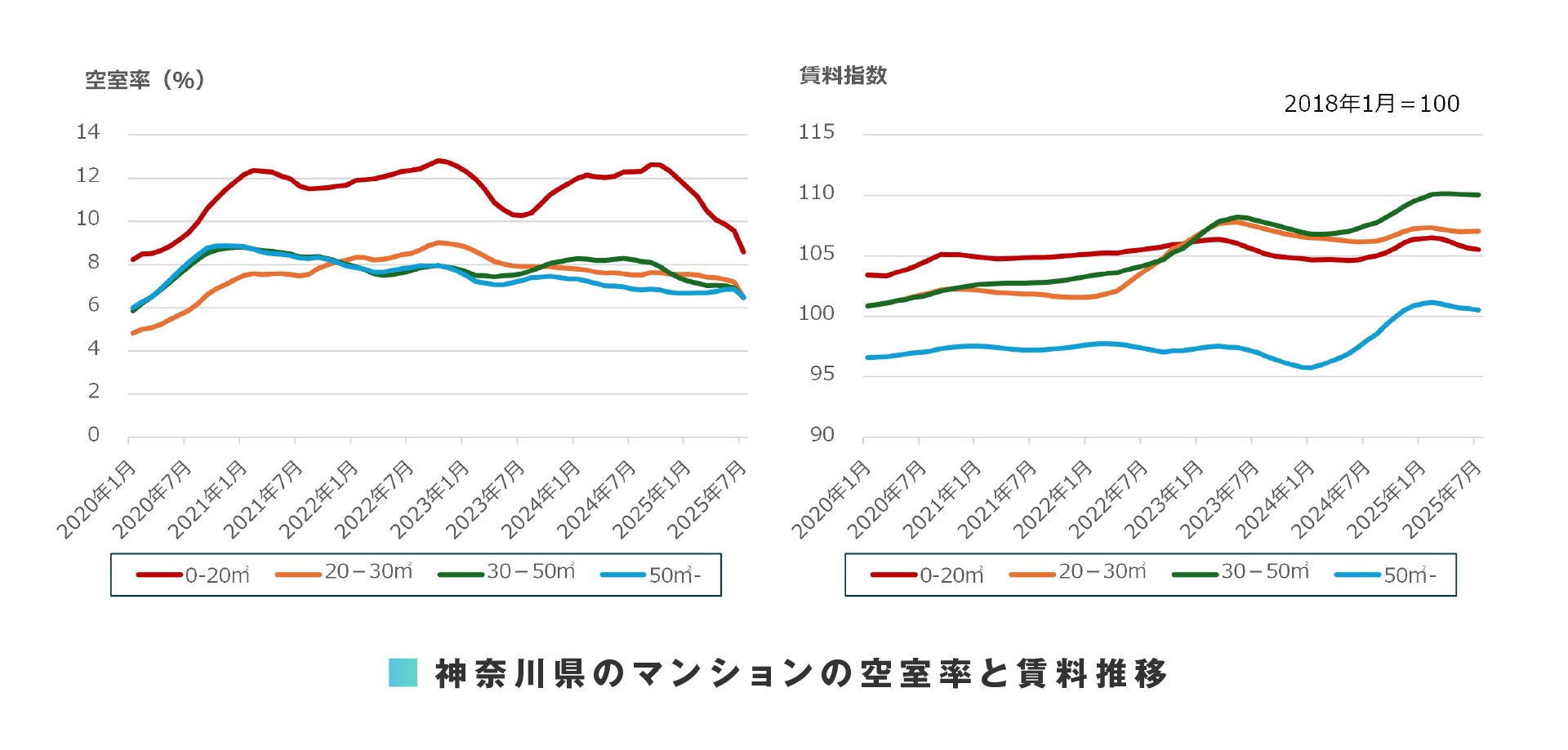 東京 23 区への時間距離が若干遠いさいたま市では、マンションの 0-20 ㎡を除き、空室率の悪化がようやく止まりました。アパートの 50 ㎡-を除き、支払賃料は上昇を継続しています。