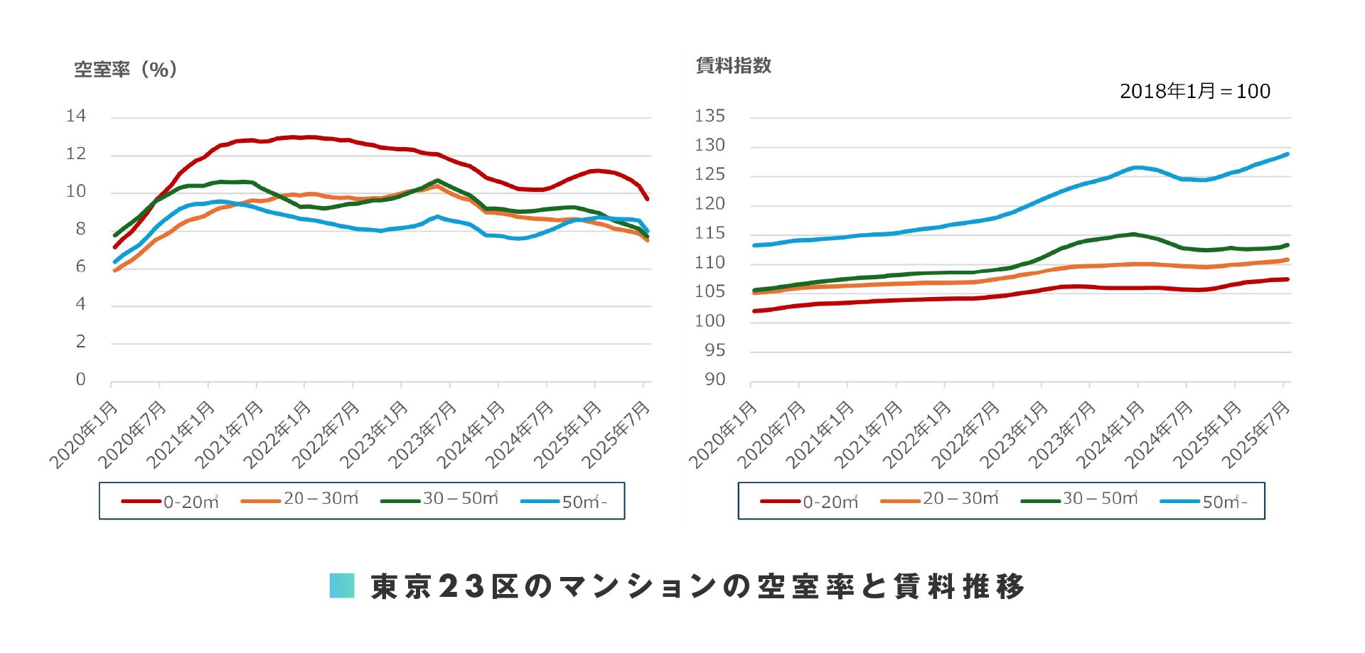 総務省の「住民基本台帳人口移動報告」によると、新型コロナウイルスの感染拡大で減少した東京 23 区への人口流入超過は 2021 年後半から 2024 年前半にかけて増加傾向で推移しました。その後、転入超過は減少傾向となっています。対して、貸家着工戸数は概ね横ばい傾向で推移しています。前月(2025 年 6 月)に、アパートの 0-20 ㎡、マンションの 50 ㎡-で前月比横ばい、その他の面積帯では前月比で僅かながら悪化となりましたが、これは転入超過の減少(需要の減少)が影響していると考えられます。2025 年 7 月は、東京23 区のアパート・マンション共に、全面積帯で前月比の空室率が改善しましたが、今後の動向には注意が必要です。募集賃料が大きく上昇していることから、テナントの入れ替えや賃料改定により平均支払賃料(以下、支払賃料)もアパート・マンション共に全面積帯で前月比上昇しました。ただし、マンションの支払賃料の上昇は、50 ㎡-を除き小幅にとどまっています。また、アパートでは全面積帯で前年同月比下落しており、家賃の高い物件が敬遠され始めている可能性が考えられます。