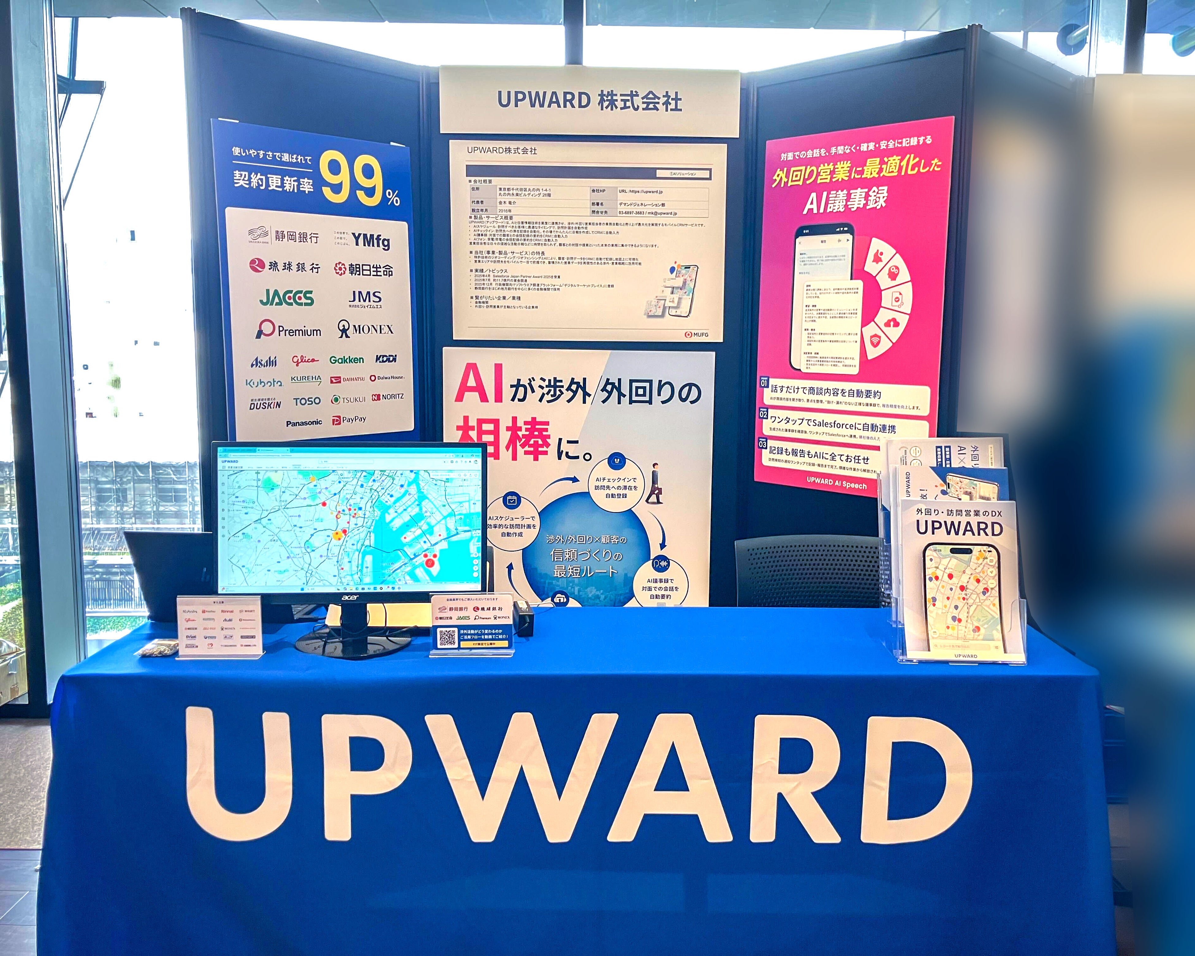 「UPWARD」は、外回り・訪問営業に特化したAIを基盤とする営業支援サービスです。自社で特許を持つ「高度なジオフェンシング技術」による顧客接点の自動記録や外回り営業に特化した各種AI機能を提供しています。静岡銀行、山口フィナンシャルグループ、琉球銀行をはじめ、顧客との対面接点を主要な営業チャネルとする大手企業を中心に約450社に導入されており、次世代の営業DX基盤として活用されています。