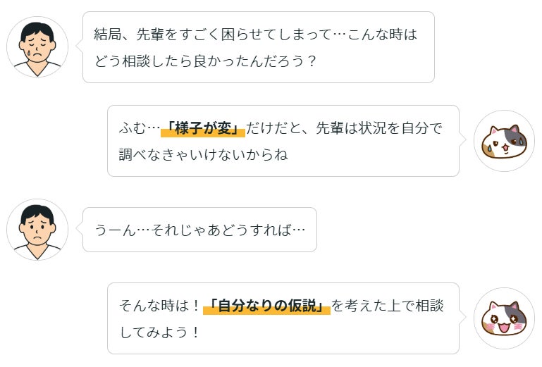 記事内では、新人介護士「カイゴさん」とおせっかい猫「うめ」の掛け合いで進行します。介護現場のリアルな悩みと解決策を会話劇で解説し、事例を“自分ごと化”しやすくしています。漫画のように読み進めるうちに自然と要点が頭に入りやすい構成となっています。
