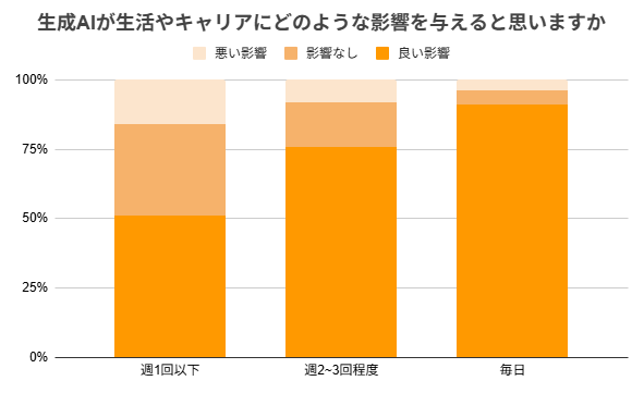 「毎日」利用する学生では、90%が「良い影響がある」と回答。「週1回以下」利用の学生では、51%にとどまり、利用頻度によって認識に差がみられました。