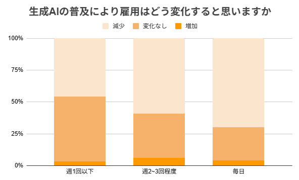 「毎日」利用する学生では、70%が「雇用は減少する」と回答。「週2〜3回程度」利用の学生では59%、「週1回以下」利用では55%と、利用頻度が低くなるにつれて懸念がやや薄れる結果となりました。