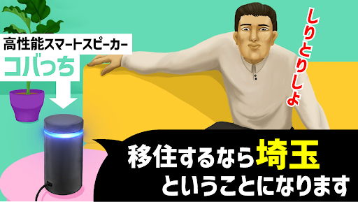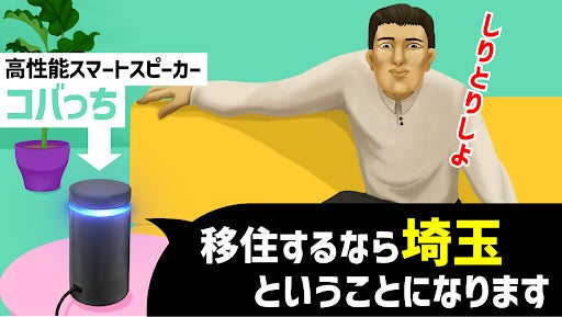 スマートスピーカーを前にソファでくつろぐ都内在住の男性。突然スマートスピーカーが速報を伝えてきます。どんなニュースなのかと思ったら、埼玉に続々誕生するテレワークスポットの情報が…