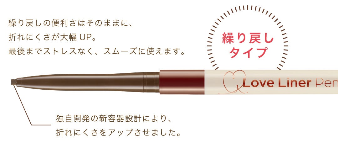容器の構造を見直し、繰り戻し機能はそのままに柔らかい芯でも折れにくい設計にパワーアップしました。