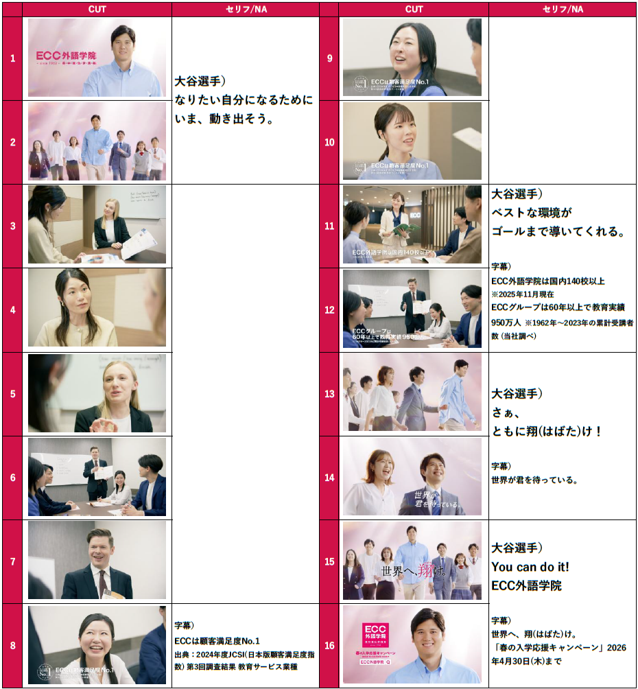 総合教育・生涯学習機関の株式会社ECC(本社:大阪市北区、代表取締役社長:花房雅博)が運営するECC外語学院は、ECCブランドアンバサダーでメジャーリーガーの大谷翔平選手が出演する新CM『ECC外語学院 生徒募集 大谷翔平選手/ともに進もう篇』(15秒、30秒)を制作。2026年1月5日(月)より、TVCM、TVerなどで順次放映・配信を開始いたします。