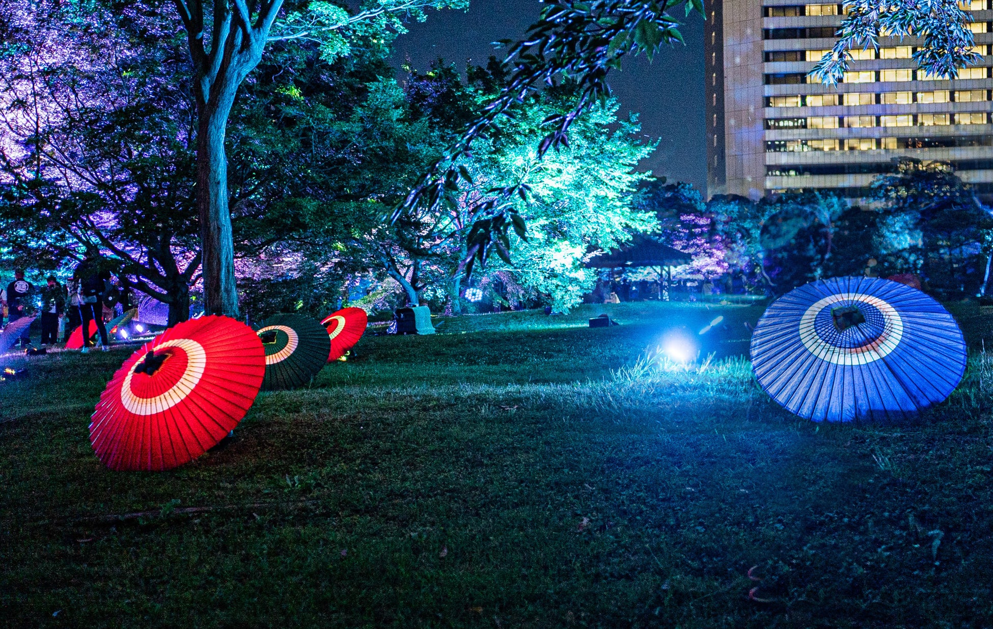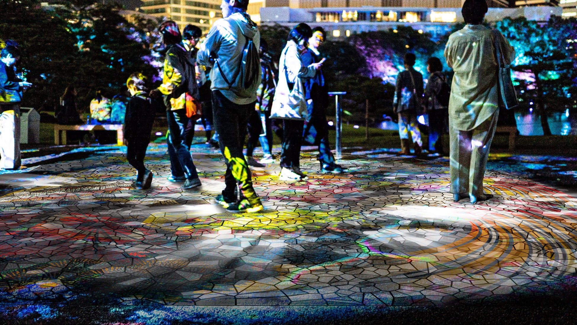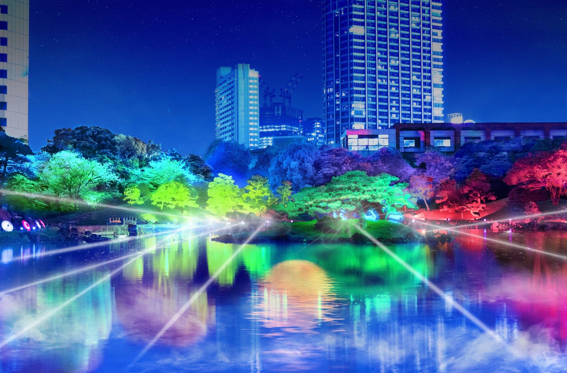 また、20分ごとに展開する約5分間のショータイムでは、庭園全景を使って、江戸から明治・大正、そして現代へと繋がる時の流れを光と音で表現。そして、ショーの最後には、伝統的な日本庭園と現代的な高層ビル群が調和する芝離宮が持つ景観美と光と音が共鳴するフィナーレを迎える演出を施しています。