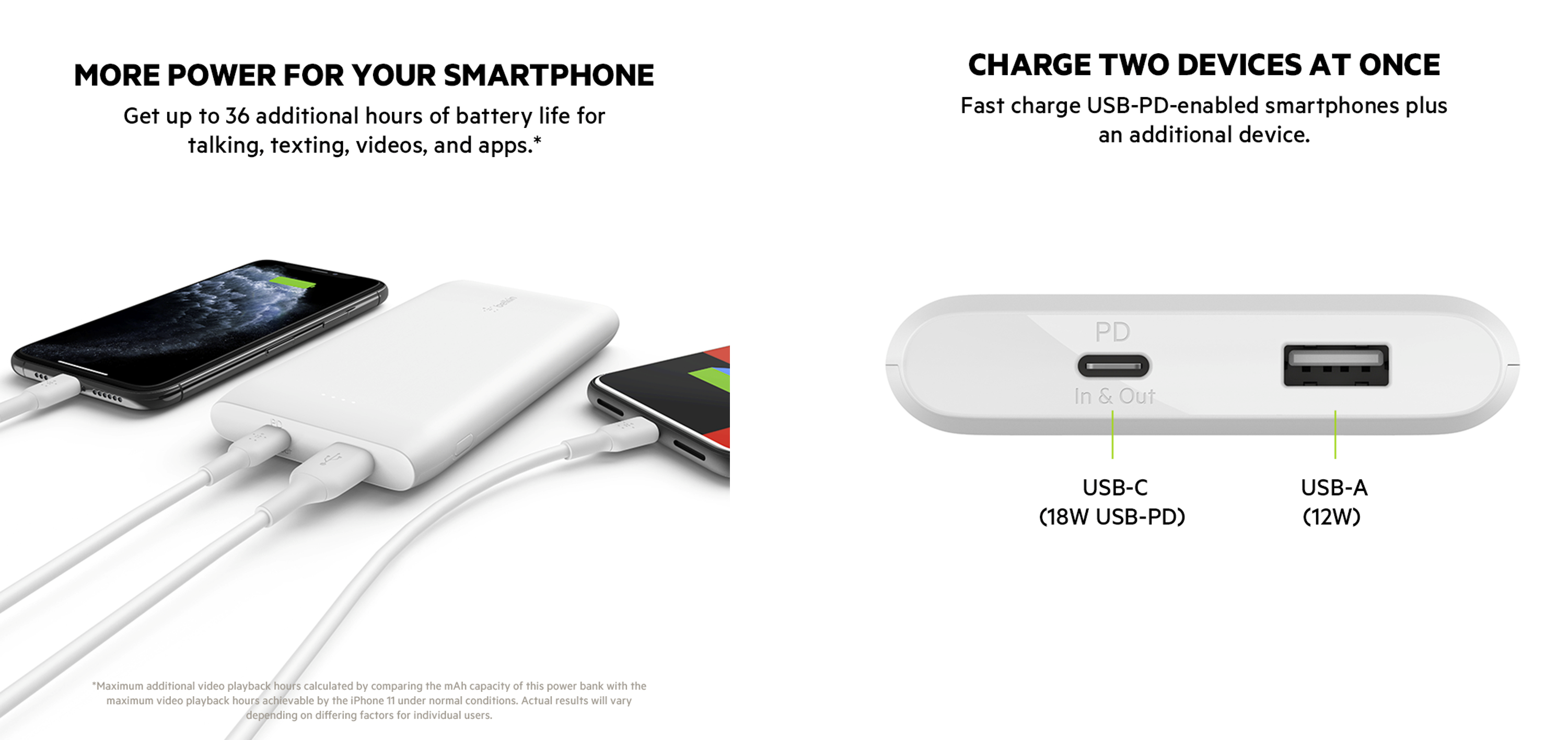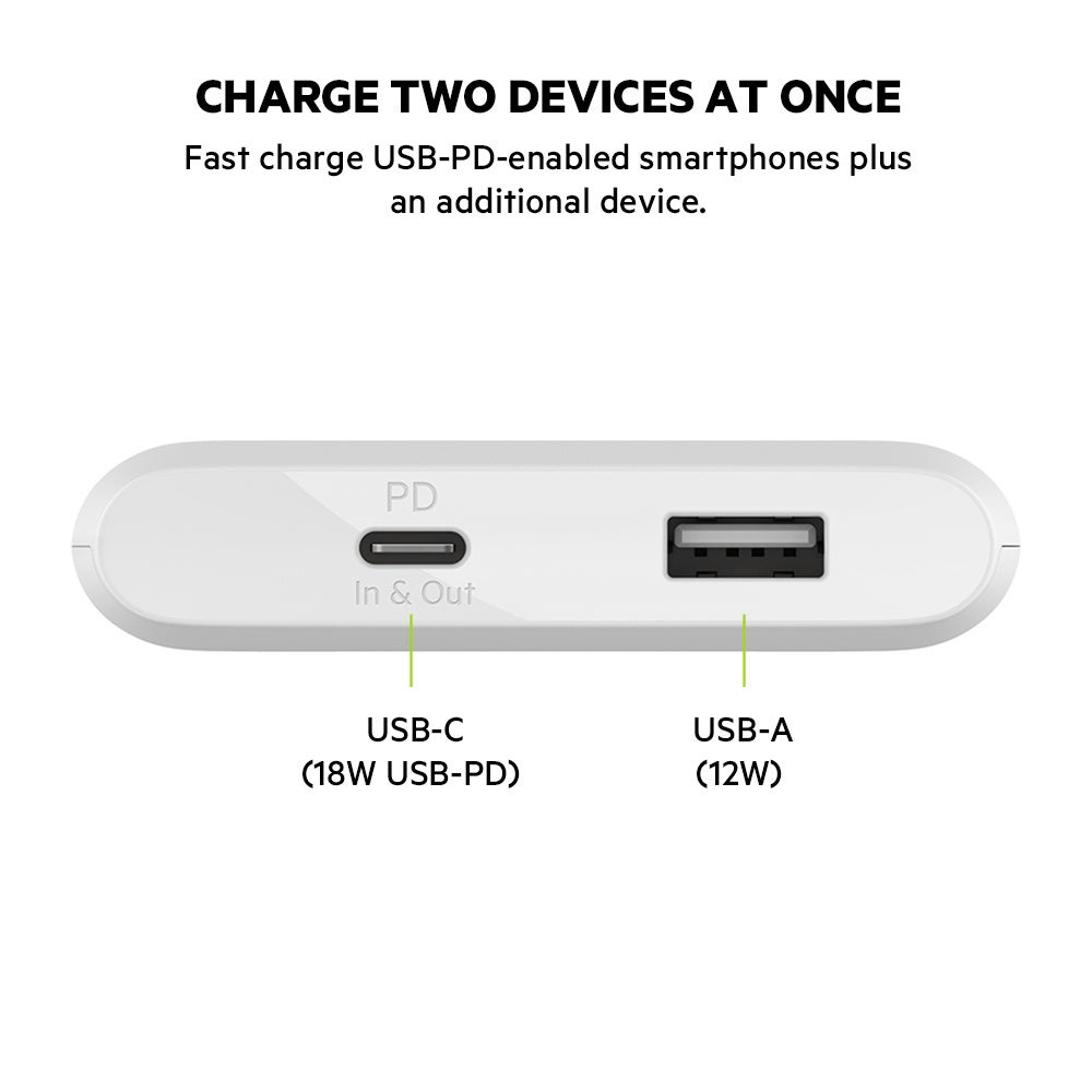 USB-C Power Deliveryに対応した本製品は、iPhoneを30分で0〜50%、USB-Cデバイスを約36分で0〜50%まで急速充電できます。また、USB-CポートとUSB-Aポートを1つずつ搭載しており、薄型でありながら最大出力18WのUSB-Cポートにて1台を急速充電しながら、もう1台のデバイスを同時に充電することができます。尚、製品にはUSB-C to USB-Cケーブルを同梱してるので、ご購入後すぐに充電を開始できます。