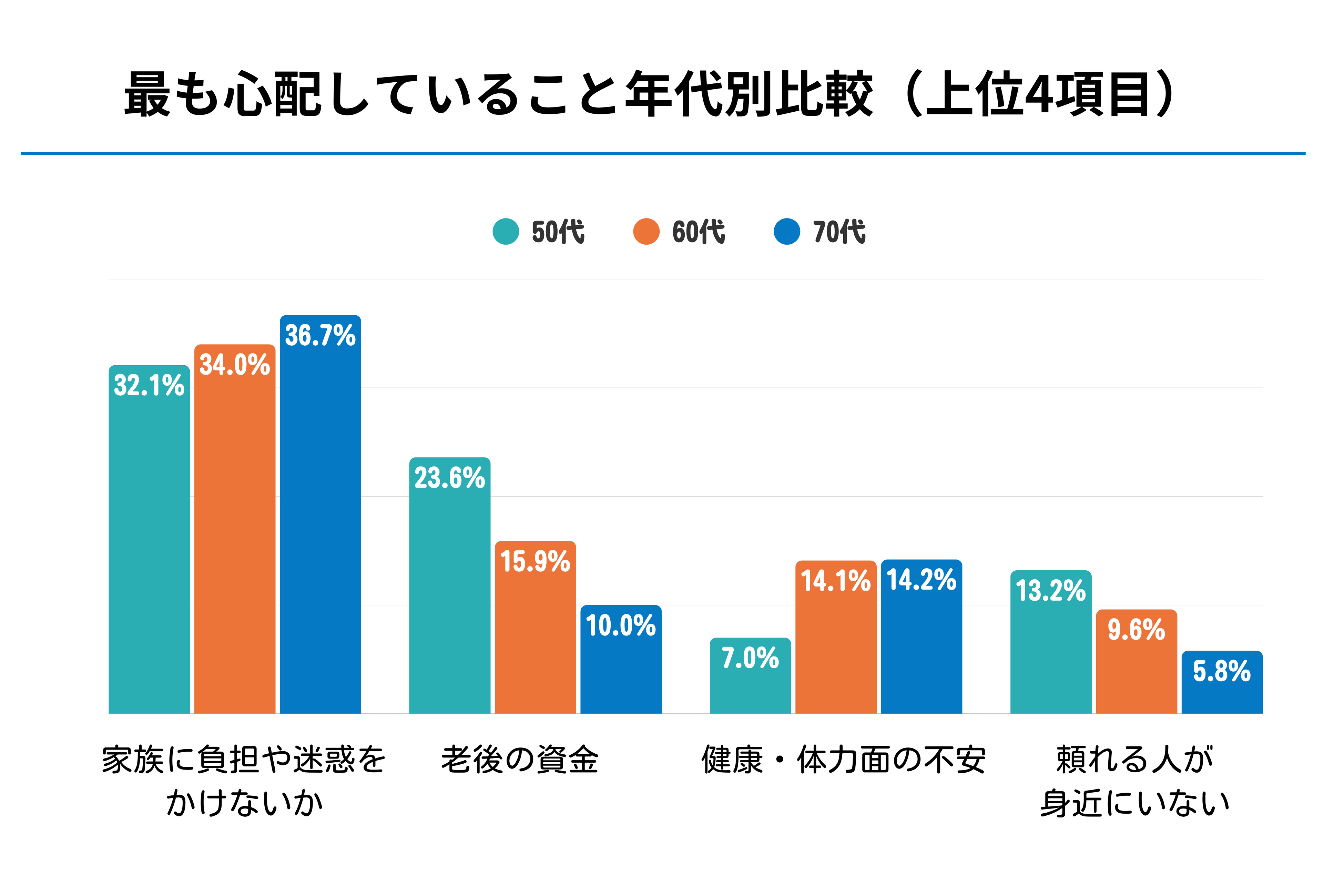年代別に見ると、「老後の資金」を最大の不安に挙げた割合は50代(23.6%)に対し、70代では10.0%と半分以下に低下する。一方、「家族への負担」は全年代で一貫して1位であり、世代を超えた共通の心理といえる。