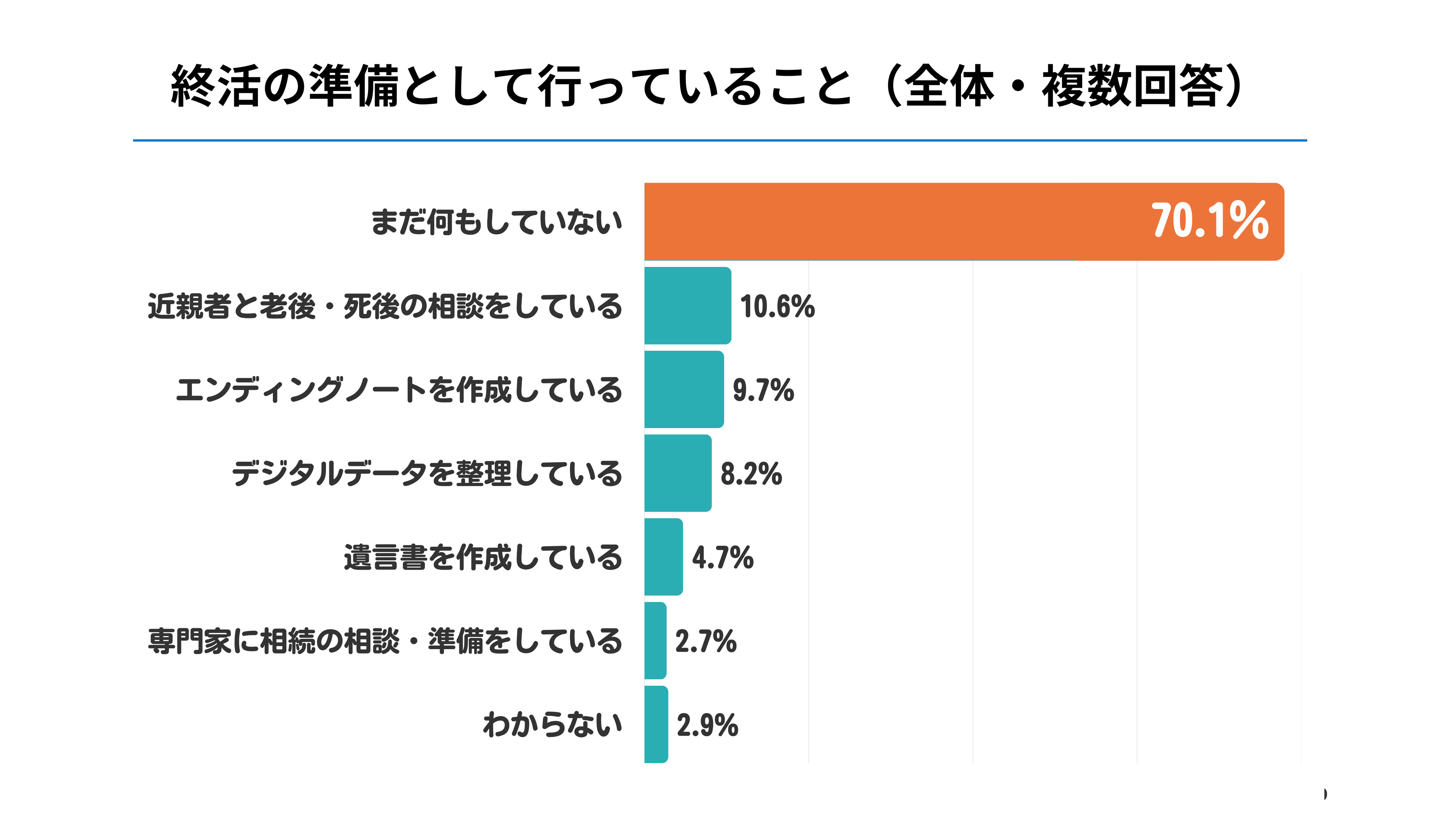 終活の準備状況を聞いたところ、「まだ何もしていない」が全体の70.1%と圧倒的多数を占めた。準備している項目では「近親者と老後・死後の相談をしている」(10.6%)、「エンディングノートを作成している」(9.7%)が続くが、いずれも1割前後にとどまる。心配の大きさと準備の少なさのギャップが、シニア世代の終活における最大の課題として浮かび上がった。