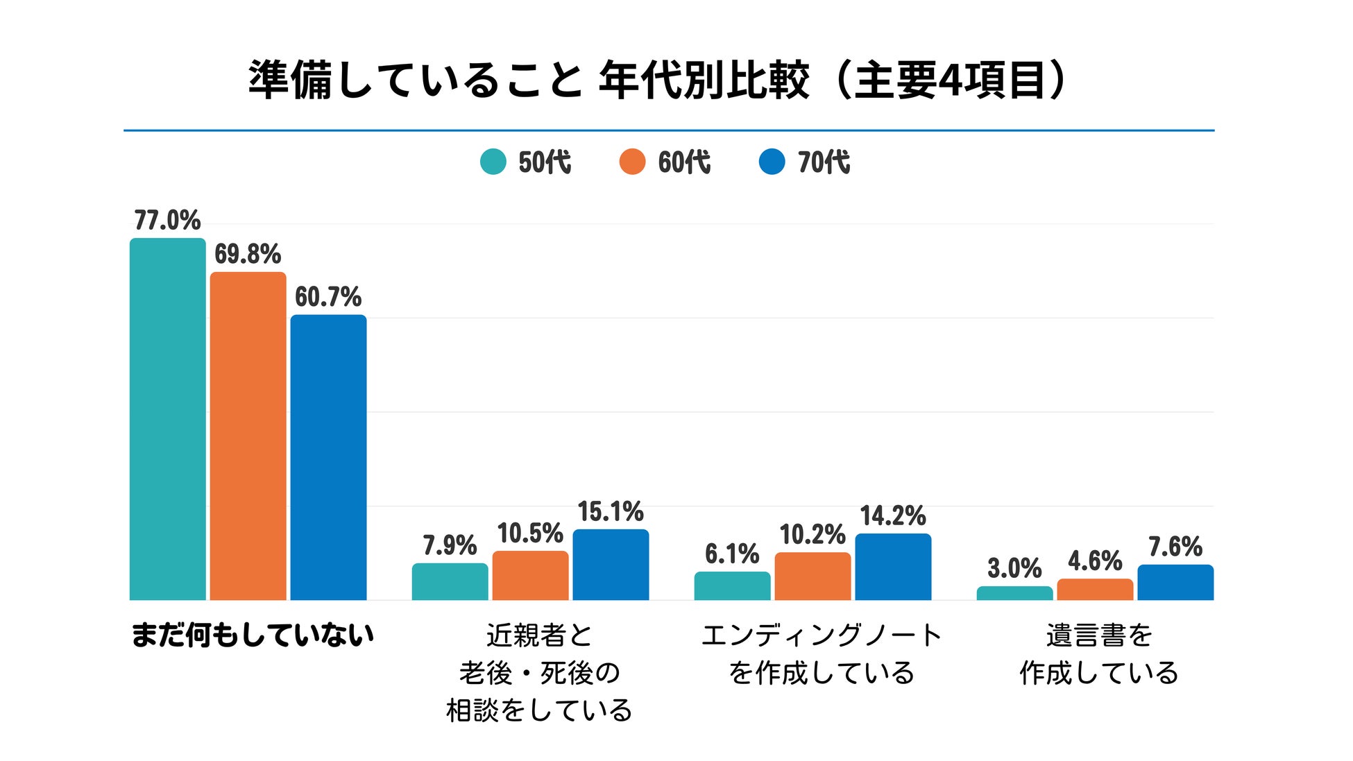 「まだ何もしていない」の割合は50代77.0%、60代69.8%、70代60.7%と、年代が上がるにつれて低下する。70代では「エンディングノートを作成している」(14.2%)や「遺言書を作成している」(7.6%)の割合が他の年代より高く、年齢が上がるほど具体的な準備行動に移る傾向が見られる。それでも70代の6割以上が未着手であり、準備を後押しする情報やサポートの必要性がうかがえる。