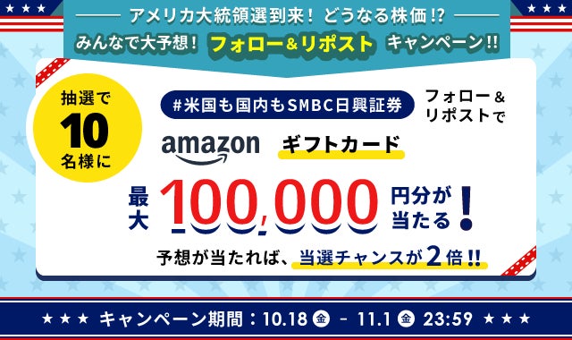 SMBC日興証券株式会社は、10月18日(金)より「アメリカ大統領選到来!どうなる株価!?みんなで大予想!フォロー&リポストキャンペーン」を実施いたします。