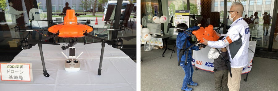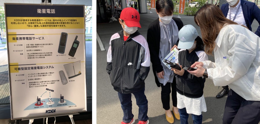 『災害対策フェスタ』では、実際の災害発生現場でKDDIが行うインフラ環境支援のために使用する「災害用ドローン」「車載型基地局」「衛生通信電話」等の実機・パネル展示やデモンストレーション、「災害時のスマホの使い方教室」「災害時のサバイバル術」を提供し、「災害発生時の状況を想定した上での行動と備え」「自分を守り、家族を守り、地域で助け合うための自助・共助の考え方」「スマートフォンを活用した災害に役立つ知識」をお持ち帰りいただきました。
