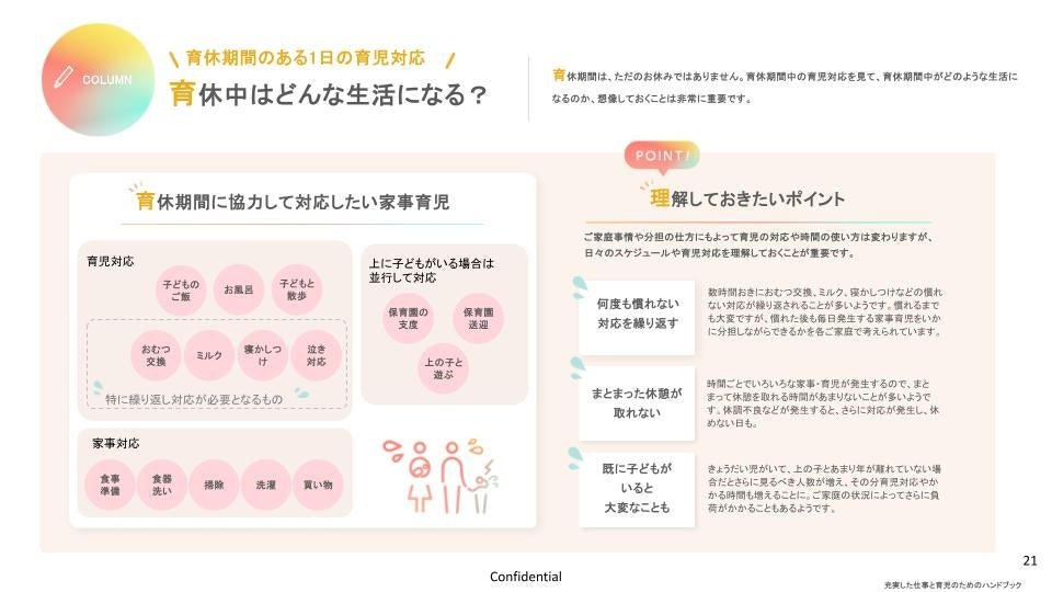 育児休業中の生活設計に役立つ金銭面の情報や、復職後に仕事と育児を充実させるためのヒントも記載しています。育児休業の取得を後押しするとともに、復職後の活躍支援を目指しています。
