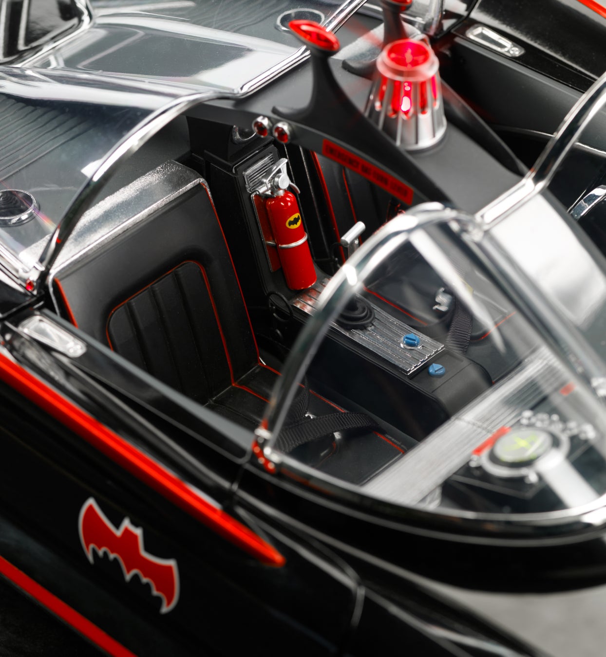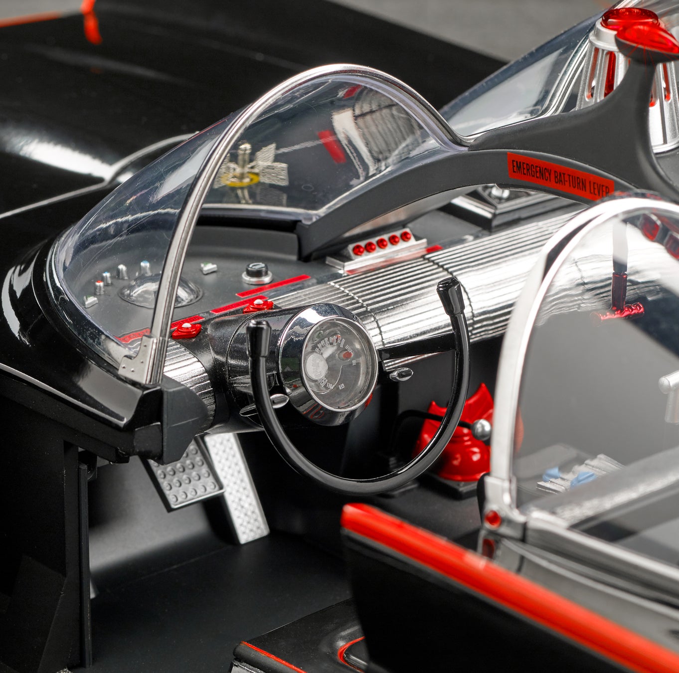 左右のドアやボンネット、トランクの開閉はもちろん、ステアリングホイールも前輪と連動。センターコンソールに配置されたバットフォンや、伸縮回転するバットスコープなど、劇中車ならではのディテールが再現されている。